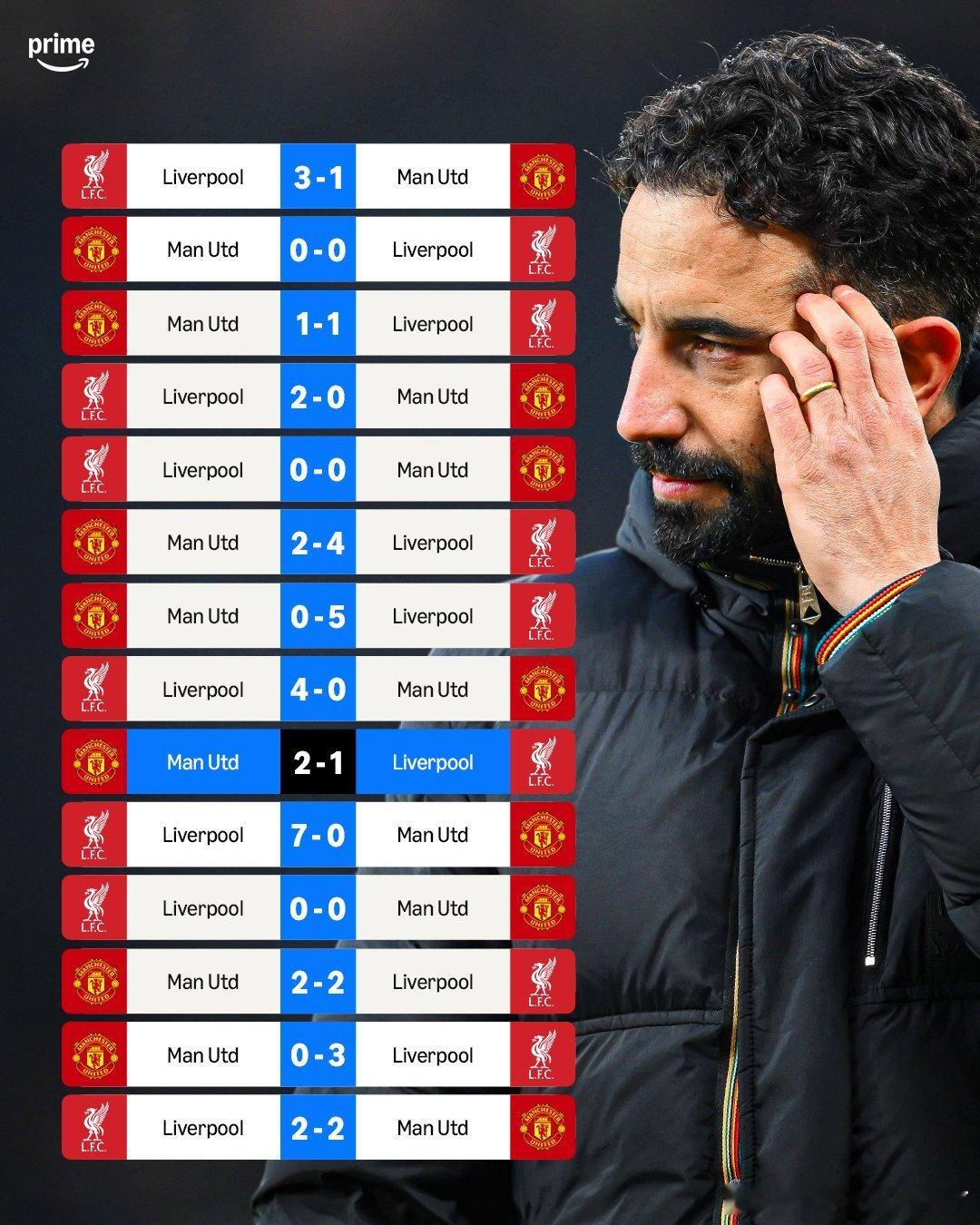 曼联在最近14场联赛对阵利物浦的比赛中仅取得1场胜利。