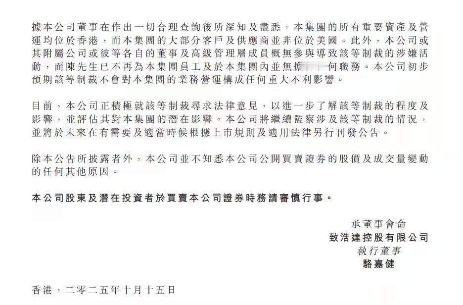 150亿美元比特币骗局震动全球,幕后“大佬”竟是这两家港股公司老板 这两天全球金融圈和反诈圈炸了锅!2025年10月14日,美国司法部纽约南区法院的起诉书,再加上美英两国联手祭出的制裁大棒,直接把柬埔寨太子控股集团创始人陈志给架到了风口浪尖,这位藏在跨国犯罪网络背后的“大佬”总算露出了真面目。 可能有人还不知道陈志是谁?这位80后福建连江人可不简单,2009年跑去柬埔寨闯荡,2015年创办太子集团,靠着和当地政商精英深度绑定一路飞升,甚至当上了柬埔寨前总理的顾问,把集团包装成涵盖地产、金融的“正规军”。可谁能想到,这光鲜外壳下藏着吃人不吐骨头的勾当——操控几十个诈骗园区搞强迫劳动、人口贩运,用“杀猪盘”把全球受害者的钱骗来,再通过127271枚比特币洗白,这笔资产如今价值高达150亿美元,堪称美国司法部史上最大规模的资产没收行动。更狠的是,他在伦敦的19处房产、纽约的毕加索画作也全被冻结,真是把“黑钱洗白”玩得明明白白。现在这人成了国际逃犯,跑哪儿去了至今是个谜,但他间接控股的两家港股公司——致浩达控股和坤集团,已经被这场风暴扫得鸡犬不宁。 先看陈志间接持股54.79%的致浩达控股,这公司早就透出颓势了。2024年营收从2023年的1.346亿港元直接腰斩,暴跌40.2%只剩8050万港元,核心的建筑工程业务就像断了电的机器,老项目交了工,新项目还没跟上趟,根本撑不起场面。虽说物业服务涨了6.7%,从840万港元涨到900万港元,但这点增长在巨亏面前就是杯水车薪。后来赶时髦搞的奢侈品销售业务,2024年赚了1040万港元,看着像根救命稻草,其实也掀不起浪花。更可疑的是,2025年7月陈志突然“跑路”,辞掉了执行董事、董事会主席所有职务,这不就是提前甩锅吗? 再看另一家间接持股55%的坤集团,更是上演了“虚假繁荣”的戏码。这家有30年历史的新加坡机电工程公司,2025年营收涨了11.7%,从6950万新加坡元冲到7770万新加坡元,表面看风光无限。可掀开账本一瞧,毛利反倒跌了12.6%,从590万新加坡元跌到510万,毛利率从8.5%滑到6.6%,说白了就是“干得多赚得少”,服务成本飙升把利润全啃光了。亏损更是吓人,从上年的9000新加坡元飙到210万,翻了232倍,这哪里是做生意,简直是在烧钱。 面对制裁,两家公司倒是口径一致地“喊冤”。10月15日双双发公告,都说自己业务不在美英、没沾涉案子,陈志也早离职了,言外之意“制裁雨浇不到我头上”。可市场根本不买账,10月17日致浩达控股跌了5.17%,市值只剩9240万港元;坤集团更惨,跌了9.19%,市值1.68亿港元,股价跟坐了过山车似的往下冲。 说真的,这两家公司的辩解听着就心虚。就算业务没直接涉案,跟陈志的资本勾连摆在那儿,投资者能不慌吗?而且陈志7月突然离职,现在想来分明是早有预谋,这波“甩锅”操作反而更让人起疑。如今150亿美元的黑产帝国塌了,这两家港股公司想独善其身恐怕没那么容易,毕竟资本的烂摊子,从来不是一张公告就能扫干净的。