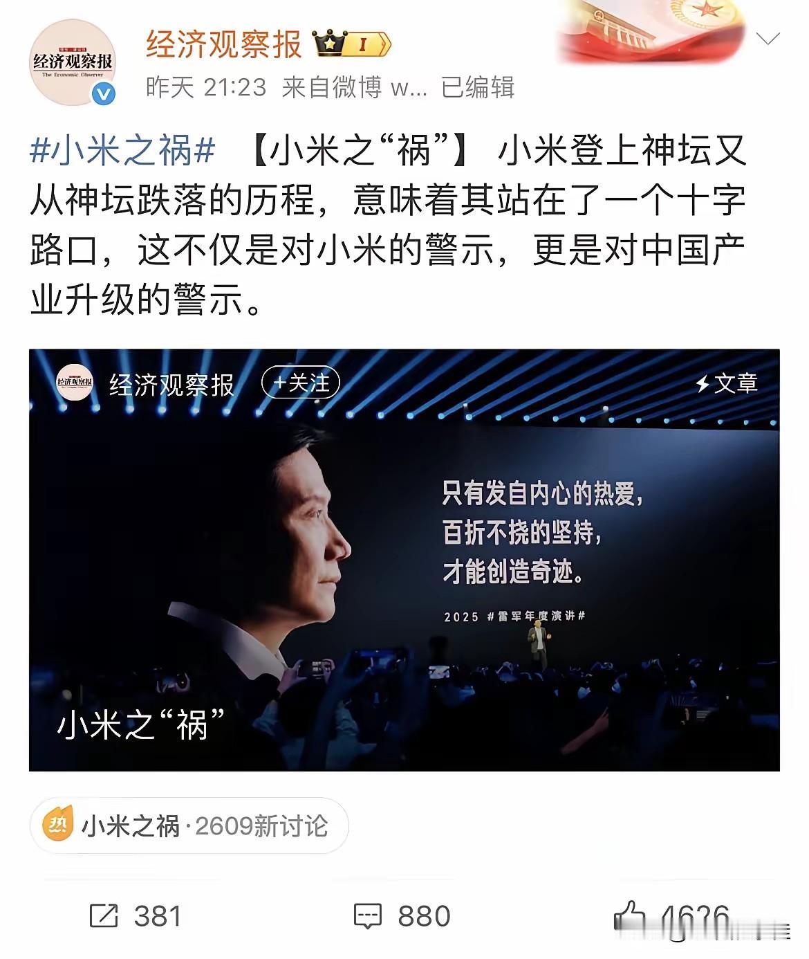 我预料到了小米的流量光环 也预料到了跨界造车的挑战 万万没想到信任危机会来得如此之快 车门打不开的质疑像潮水般涌来时,雷军正测试着新车的盘山古道。3500米海拔,600道弯,入口标语写着今日走尽弯路,人生皆是坦途。这话听着像是对小米的隐喻。 碳纤维风道被验证缺乏导流功能,1548匹马力需要刷赛道才能解锁。宣传术语悄悄从智驾改为辅助驾驶,这些细节抽走了信任的砖石。成都事故后,直播间里挤满了追问安全的人,但更深的裂痕早在三月那场致命碰撞时就已蔓延。 我看到有车主组建退车群,用联合视频声明要求解除合约。国家质量网站给SU7的评分垫底,虽然另一家机构给出相反数据,但信任的崩塌只需一个缝隙。翼子板在阳光下翘边,专家说这是热胀冷缩暴露的设计经验不足。这些看似细小的问题,叠加起来成了沉重的枷锁。 小米的展厅里依然有人排队体验新手机,空调和洗衣机销量还在增长。但汽车不同,它关乎性命,容错率太低。当消费者开始用放大镜审视每个焊缝和标点,任何水汽都会凝结成冰。
