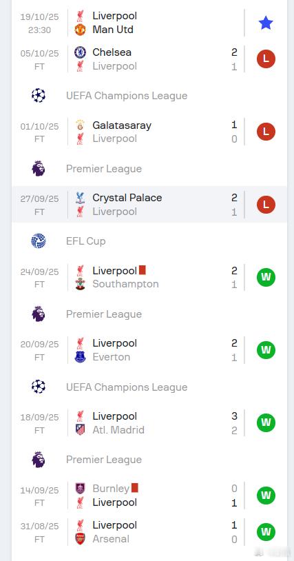 利物浦vs曼联 利物浦球迷应该发现了本赛季一个特点,除了社区盾杯点球输球,联赛首轮4-2伯恩茅斯,此后的9场比赛,获胜的6场和输掉的3场,比分差都是一个球。利物浦没有大胜过,也没有惨败过,反正,就是差一个球。欧冠输加拉塔萨雷是0-1,联赛输水晶宫、切尔西都是1比2这个比分。这是不是一种规律?利物浦