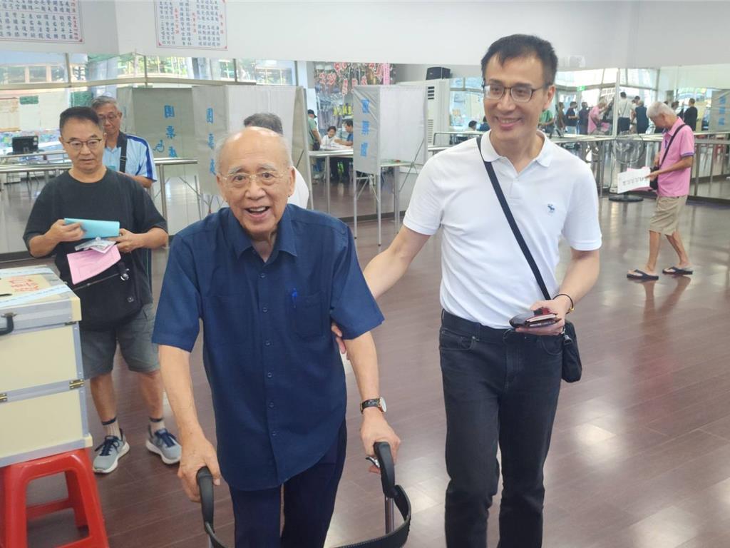 前国民党主席、“伯公”吴伯雄(左)在其子、台北市议员吴志刚(右)的陪同下,一同抵达投票所,顺利完成了投票。