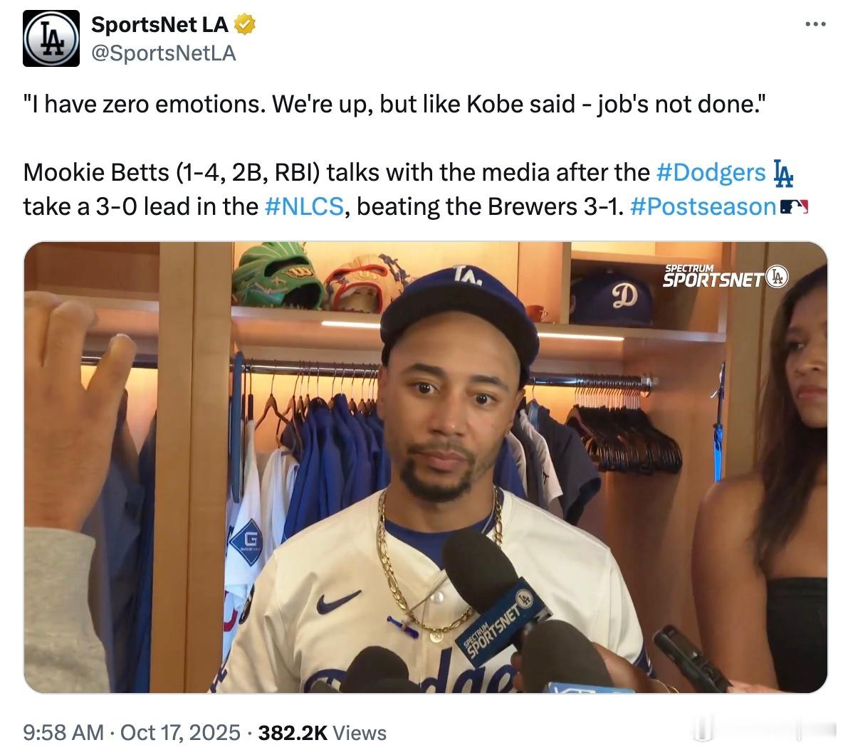 3比0和横扫酿酒人后,贝茨和罗伯茨都说了科比说过的那句Job'snotdon