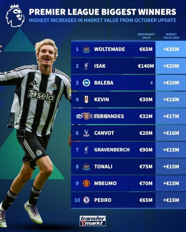 【英超身价涨幅榜:沃尔特马德+3500万欧居首,伊萨克+2000万欧次席】