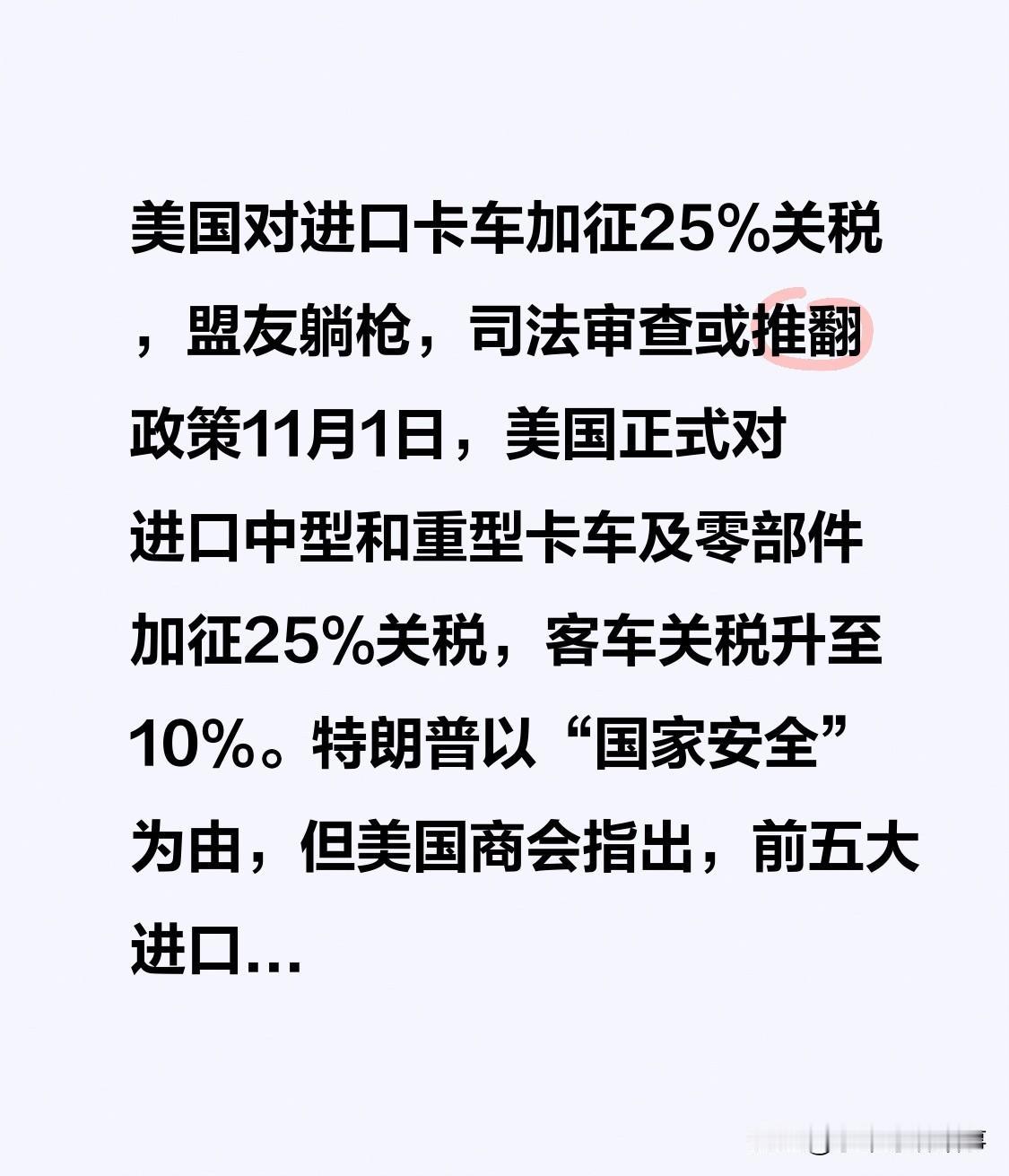 震撼!美国对进口卡车加征25%关税,盟友受牵连,司法审查或推翻政策 11月1日,美国正式对进口中重型卡车及零部件加征25%关税,客车关税提至10%。特朗普称出于“国家安全”,但美商会指出,前五大进口国(墨西哥、加拿大等)皆为盟友,并无安全威胁。11月联邦最高法院将审议关税合法性,政策或被推翻。分析指此举或加剧全球贸易摩擦,损美经济利益。