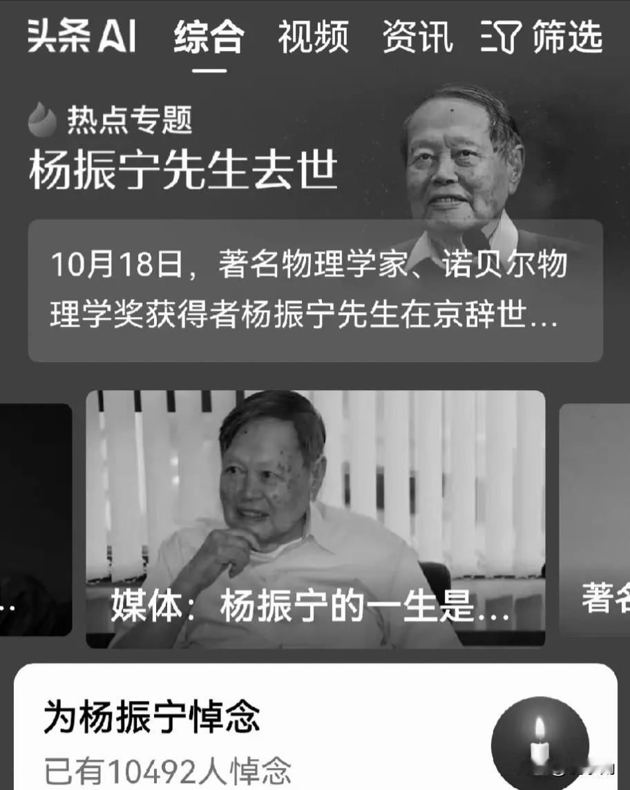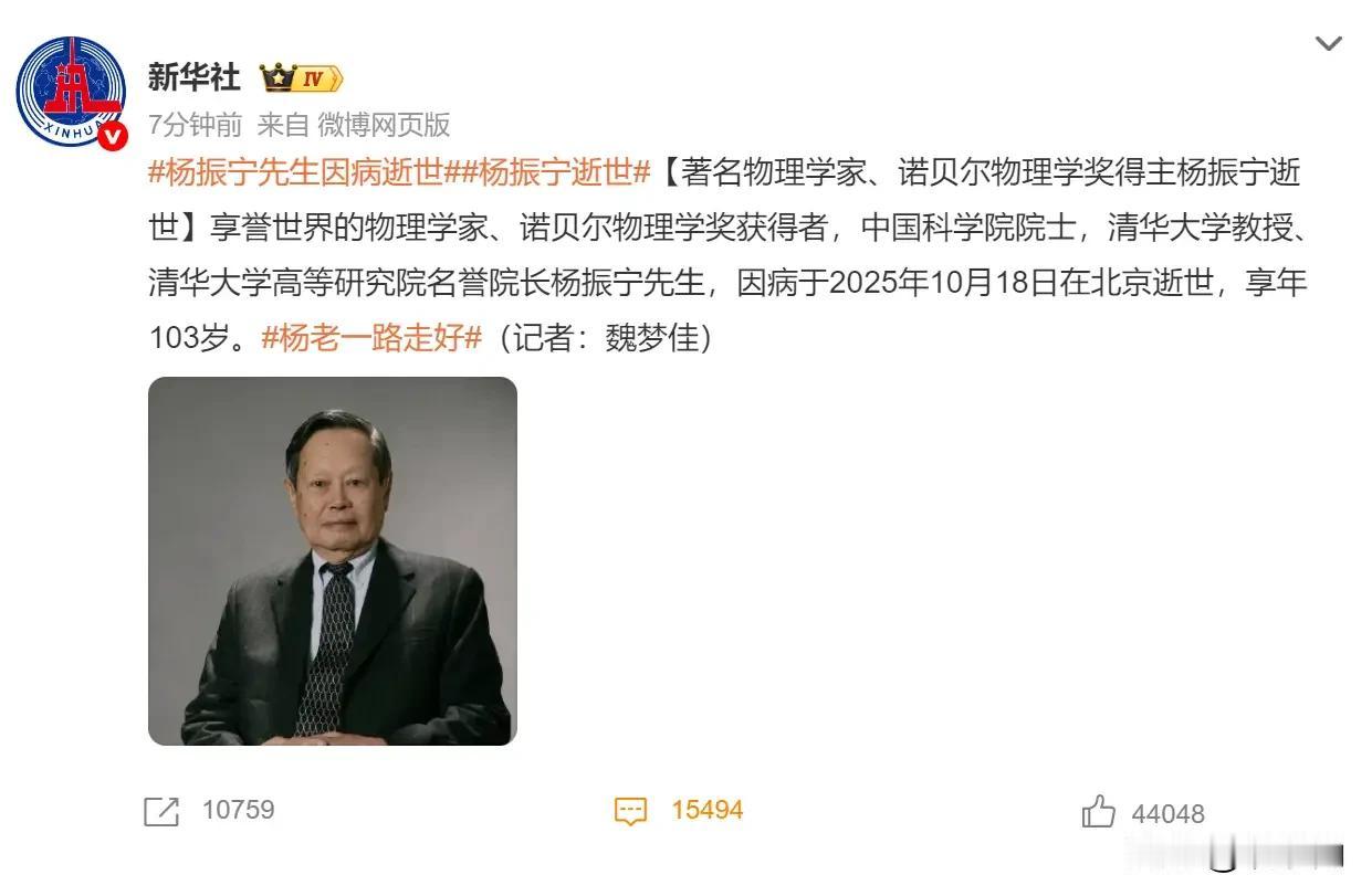 今天中午,一条消息刷屏了!杨振宁先生走了,享年103岁。很多人不知道,这位物理学泰斗少年时在图书馆看到一本叫《神秘的宇宙》的书后,竟对父母说:“将来有一天我要拿诺贝尔奖!”当时父亲只当是孩子不知天高地厚,谁料1957年35岁的杨振宁真的站上了诺贝尔领奖台。 1929年,杨振宁7岁时,父亲杨武之被聘为清华大学数学系教授,全家搬进了清华园。 少年时代的杨振宁读到科普书《神秘的宇宙》,他被书中奇妙的宇宙深深吸引住。 父亲杨武之后来在一张照片背后写下:“振宁似有异禀,吾欲字以伯瓌。”虽然表面没太当真,但心里还是觉得这孩子有点与众不同。 1957年,35岁的杨振宁和李政道因“宇称不守恒”理论共同获得诺贝尔物理学奖。那一刻,少年时他的一句狂话竟成真了。 让人动容的,是杨振宁后半生的选择。2003年,81岁的杨振宁回国定居清毕。他不仅不领年薪,还把美国的一栋房产捐给了学校。2004年9月,82岁高龄的他,主动为100多位大一新生授课,你想想,诺贝尔奖得主亲自给本科生上课,确实很少见。 82岁那年,杨振宁和28岁的翁帆结婚。当时好多人都不看好这段婚姻。可这对夫妻携手走过20余年,翁帆说是杨振宁塑造了现在的她,杨振宁称翁帆是上帝给他的最后一份礼物,争议最终变成了佳话。 杨振宁的学生曾说:“宁拙毋巧,宁朴毋华”是他的座右铭。前四个字讲的是科学精神,后四个字说的是人格特征,他这一辈子,不投机取巧,不华而不实,踏踏实实做学问,真真切切爱国家。 他把自己的人生比作一个圆,从清华园出发,走向世界,最后又归根故土。103年的人生,跨越两个世纪,连接中西文化,这个圆画的圆满漂亮。 今天他走了,但他一生的贡献会被我们一直记在心里。 杨振宁院士,一路保重! 作品声明:信息来源@新华社 事件时间:2025-10-18 事件地点:北京逝世,享年103岁