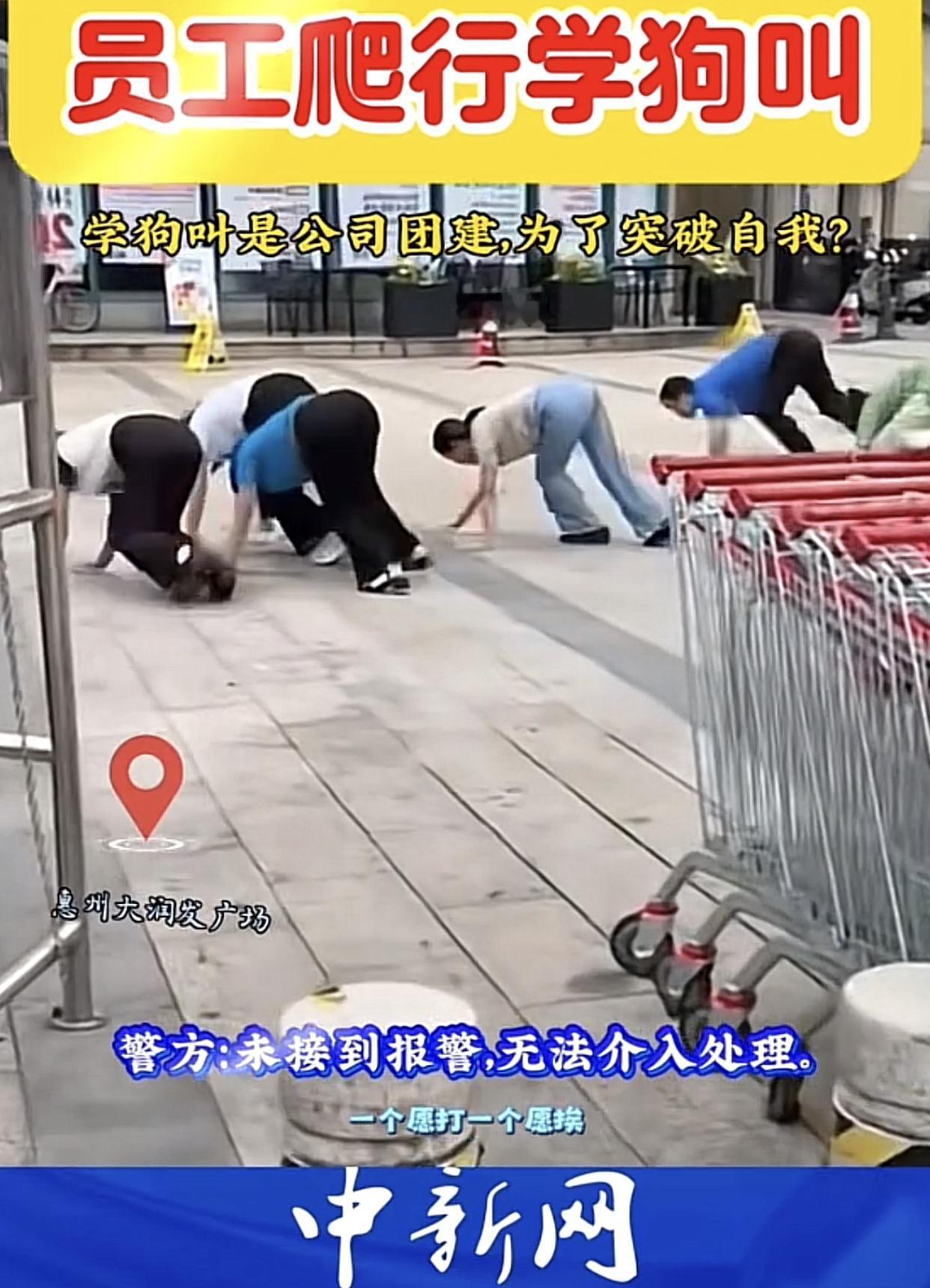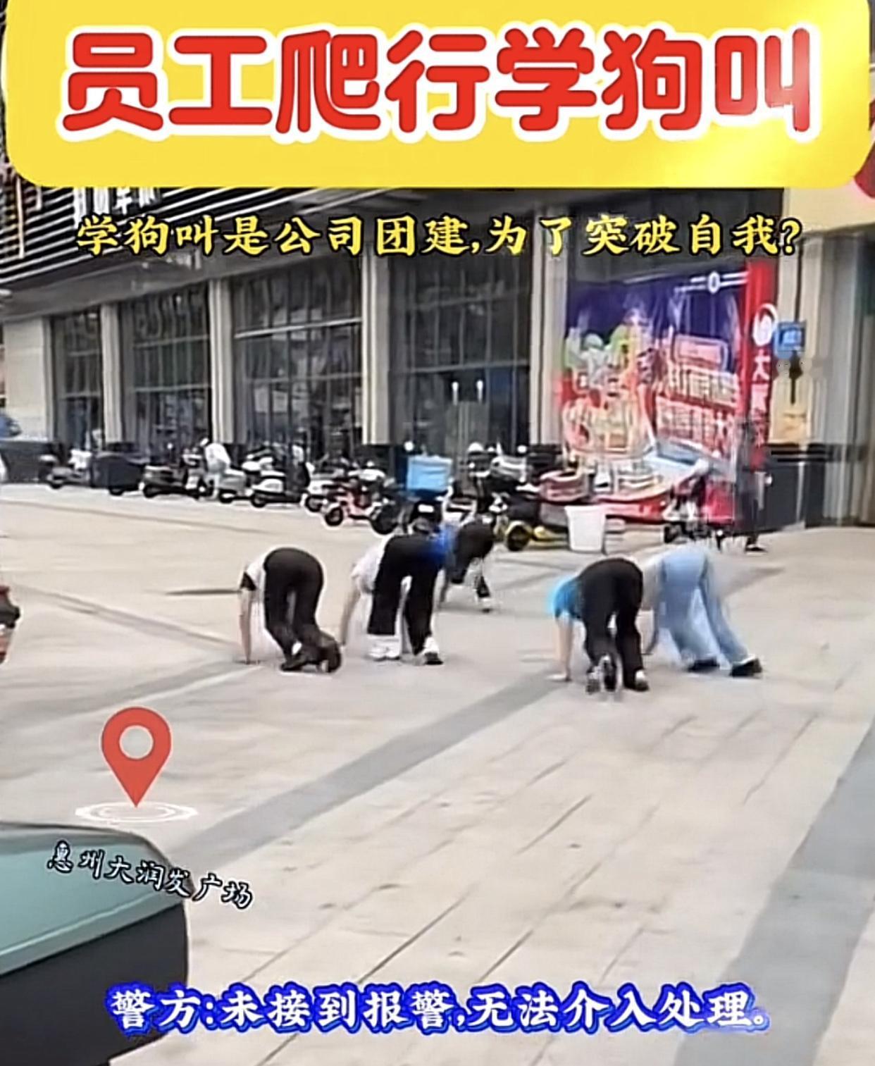 广东惠州,某智业教育咨询公司举办团建,一群男女员工学 狗爬着走,还边爬边学 狗叫。公司负责人说,“是帮员工克服社恐,突破自我!” 前提是,员工真的是自愿还是被强迫呢? 显然,该公司的目的就是让员工无条件服从,把员工教训的服服贴贴,公司至上!再怎么,也不可以以羞辱的方式逼迫员工做这有失尊严,违背公序良俗的事。(来源:中新网) 团建本来是拉近大家距离,结果搞成这种低俗的事,还是教育公司干的,这不更离谱吗?真正的团队凝聚力,靠的是互相尊重,不是让大家到大街上丢面子,这种操作真的该好好反省。一个没有温度的公司是无法承担社会责任的,把唯利是图表现得淋漓尽致。