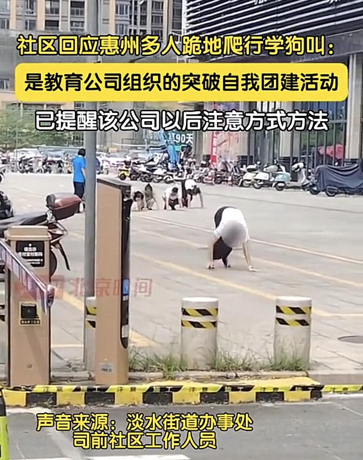 广东惠州,某智业教育咨询公司举办团建,一群男女员工学狗爬着走,还边爬边学狗叫