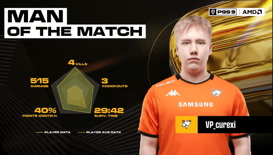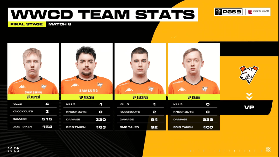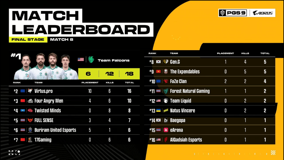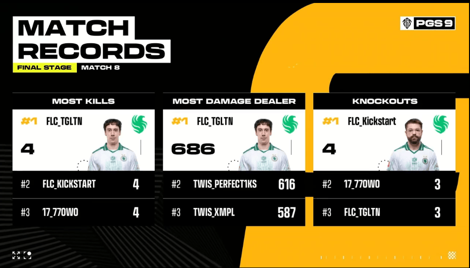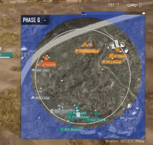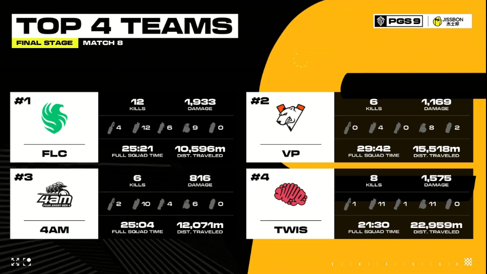 阶段7,FLC将BRU独狼清理。场上剩余VP四打三FLC,VP占据绝对地形优势和人数优势,VP轻松淘汰FLC成功吃鸡。