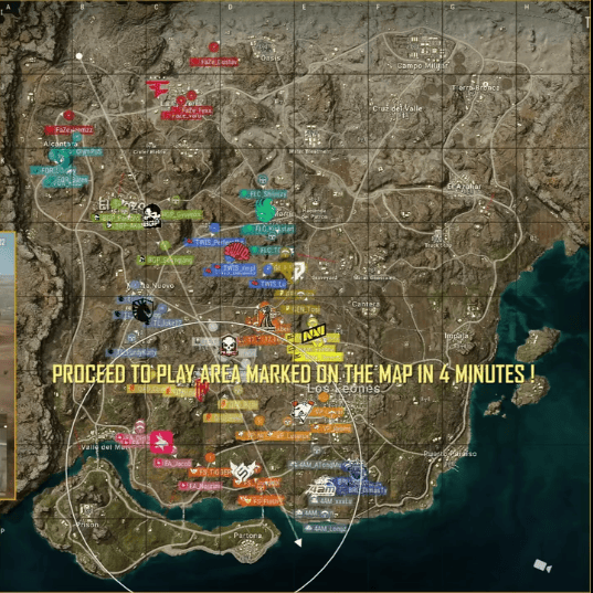 阶段6,圈型刷在地图南部悬崖附近,4AM圈边与FS交战,但FLC抓住机会前来劝架,4AM被淘汰,另外一边VP也将FS淘汰出局。