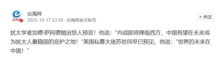 [浮云]犹太学者加德·萨阿德抛出惊人预言!他说:“内战即将降临西方,中国有望在未来成为犹太人最稳固的庇护之地!”美国私募大佬苏世民早已预见,他说:“世界的未来在中国!” 萨阿德的观点,听起来似乎有些匪夷所思,但若将其置于全球秩序剧烈变动的宏大背景下,便不难理解其逻辑起点。 放眼当下的西方社会,一股深刻的危机感正在蔓延,英国预言家帕克甚至直言,西方国家正因移民问题和多元文化政策引发的意识形态冲突,而滑向“内战”的边缘。 这并非危言耸听,从美国部分群体中重新抬头的反犹言论,到欧洲因特定国际冲突而激化的社会对立,都折射出西方社会内部凝聚力的衰退。 桥水基金创始人瑞·达利欧也警告,我们正处在一个“一生仅见”的系统性崩溃周期,旧有的政治与地缘政治秩序正在瓦解。 这种动荡不安的社会环境,对于历史上屡经流散、对安全有着特殊敏感度的犹太民族而言,无疑构成了潜在的威胁。 与此同时,中国正展现出一种截然不同的稳定性和确定性,这种确定性首先体现在中国对全球治理的全新思考与实践上。 中国近年来提出的全球发展、安全、文明和治理四大倡议,并非空洞的口号,而是旨在构建一个更加公平、包容、均衡发展的世界秩序的清晰路线图。 这些倡议的核心,是尊重主权平等和倡导多边主义,致力于通过和平发展而非零和博弈来解决全球性挑战,这与当前国际社会某些区域的混乱形成鲜明对比。 中国正以一个负责任大国的姿态,为动荡的世界提供宝贵的公共产品和稳定力量。 如果说萨阿德的视角更多是基于安全与文化的考量,那么苏世民的行动则代表了全球顶尖资本的理性抉择。 苏世民不仅是说说而已,他身体力行地将黑石集团的大量投资业务布局在中国,管理资产规模已突破330亿美元。 苏世民甚至斥资捐建清华大学苏世民书院,旨在培养了解中国的未来全球领袖。 尽管中美之间存在经贸摩擦与竞争,但中国庞大的内需市场、完整的产业链以及在新能源、人工智能等前沿科技领域的领先地位,意味着放弃中国就是放弃未来。 他看到的,是一个即使在外部压力下,依然能激发强大自主创新动力、持续优化营商环境的经济体。 苏世民的行为证明,他所“押注”的不仅是中国经济的增长潜力,更是中国社会长期稳定的发展前景。 当然,任何预测都带有其局限性,未来世界格局的演变也充满变数。 但萨阿德和苏世民的观点,就像两面镜子,映照出全球力量对比和时代潮流的深刻变迁。 信息来源:台海网