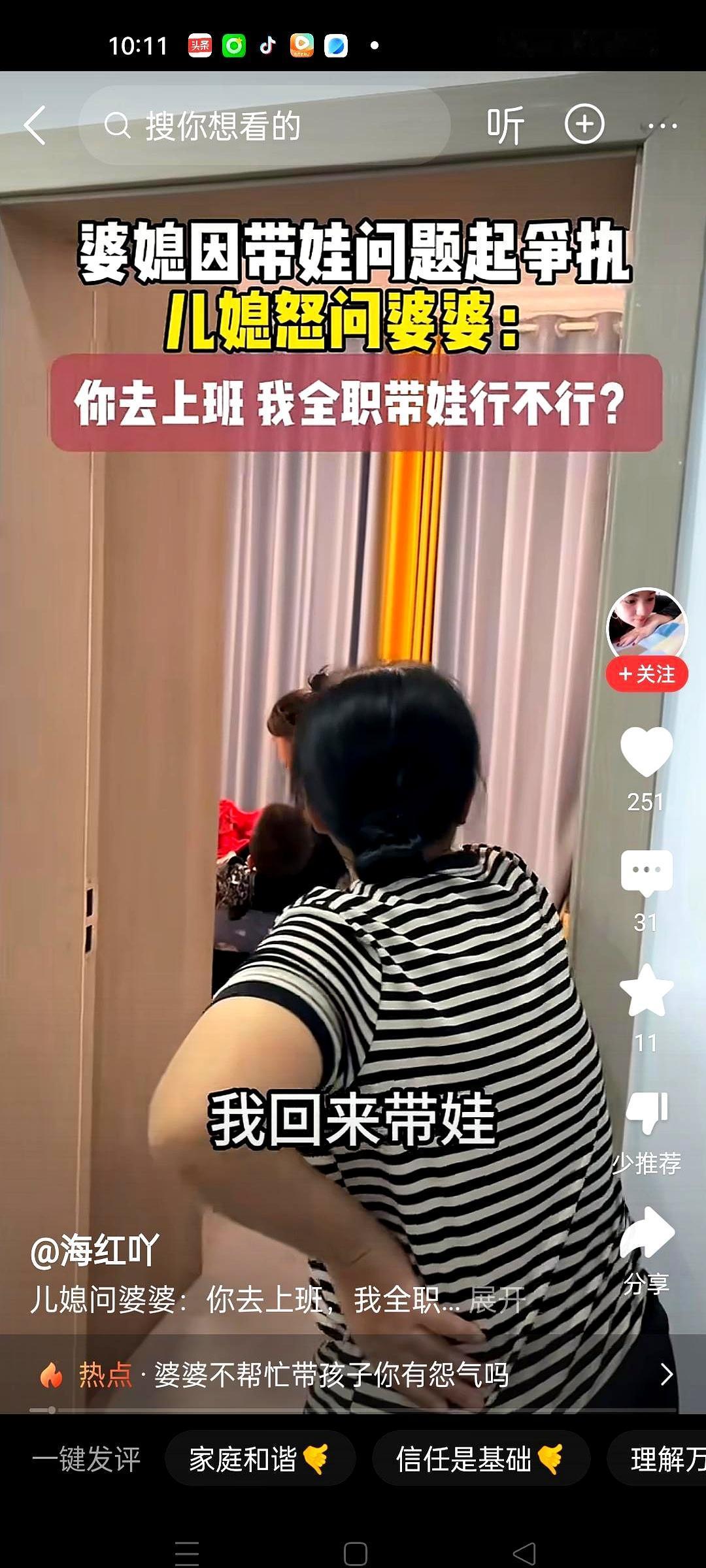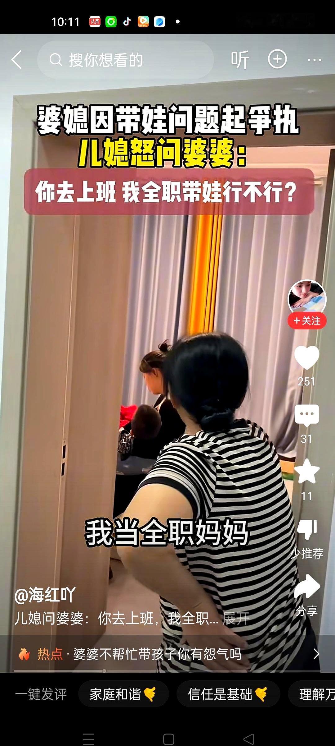 “‘明天我辞职,你去上班!’王芳摔门进屋,把包砸在沙发上,指着婆婆的鼻子吼道。”这声怒吼让婆婆手里的菜篮子“哐当”落地,豆角滚了一地。 “就说了句带娃腰直不起来,你至于吗?”婆婆抹着眼泪,声音发颤。 王芳红着眼圈掉泪:“我天天加班到十点,回家娃哭着要妈妈,你倒好,坐沙发上刷手机,还说‘带一天娃比上班累多了’——你试试我的班!” 这事在网上吵翻了。 @爱唠叨的李姐叹气:“婆婆搭把手是情分,哪能当本分?当初我儿媳产假结束,我主动说帮带,现在每天接送孙子、买菜做饭,她下班还能吃口热乎的,一家人哪能算这么清?”@职场妈妈晓敏却共情王芳:“我婆婆也总说‘带娃累’,可她上午跳广场舞,下午打麻将,娃尿了裤子都等我下班换,我每月给3000生活费,真不如请个月嫂省心。” 数据显示,我国超60%的婴幼儿依赖祖辈照料,某家庭研究所2024年调研发现,38%的隔代家庭因“责任分工”吵架。 中国老龄科学研究中心同期报告更指出,72%的祖辈每周带娃超40小时,45%感到“身心俱疲”;而年轻父母中,68%每月给老人2000-5000元生活费,仍有53%觉得“花钱难换省心”。 眼下托育服务覆盖率仅35%,多数家庭还得靠老人撑着。 带娃本就不是一个人的事,这账该怎么算?