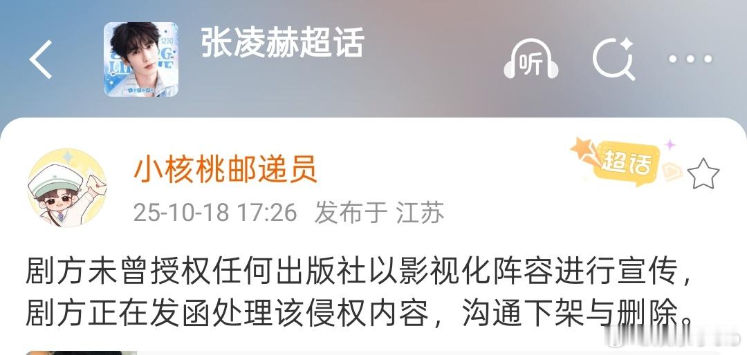 “剧方未曾授权任何出版社以影视化阵容进行宣传,剧方正在发函处理该侵权内容,沟通下架与删除。 ”