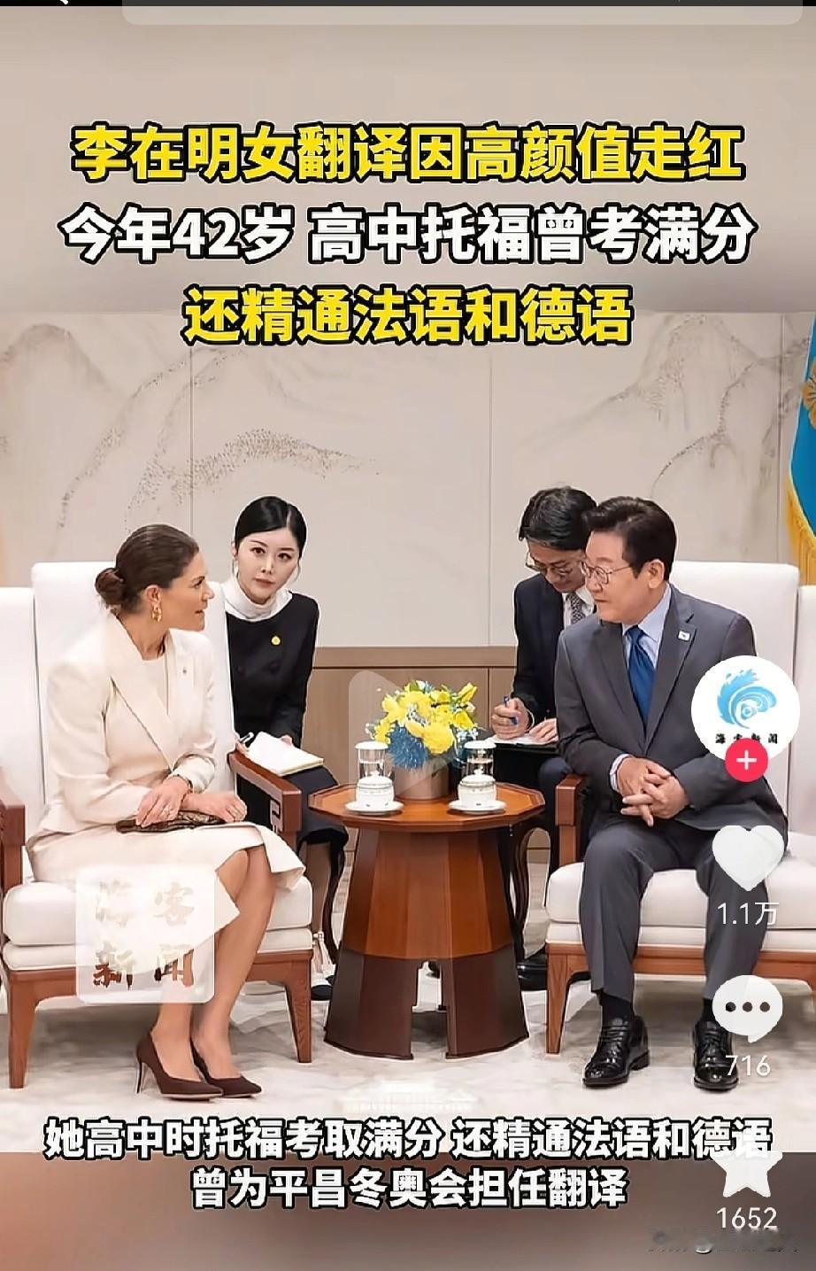 我有预感,李在明身边女翻译要火出圈! 就是赵周妍被全网盯上了! 赵周妍42岁,高中托福考满分,还会法语德语,在高丽大学和梨花女子大学念过书,平昌冬奥会都找她做翻译,翻译功底扎实得很,这次跟着李在明见瑞典女王储,一亮相就被盯上了。 镜头扫过翻译席,她穿职业装特精神,脸蛋精致气质好,外交场合那么严肃,她往那儿一坐,工作认真又淡定,比男翻译还吸睛,网友眼睛都看直了。 这样又美又能打的女翻译,谁不盼着她多露脸?
