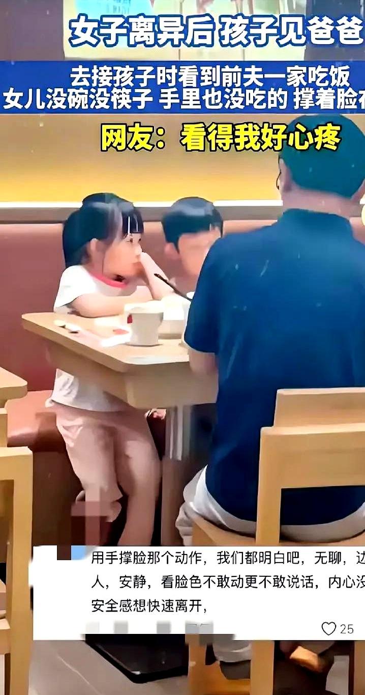 7岁的朵朵蹲在墙角,小手撑着下巴直咽口水。 隔壁桌,火锅正咕嘟冒泡,肥牛卷在红汤里翻滚——这是上周三傍晚,李女士去前夫张强家接女儿时撞见的一幕。 孩子小声说“饿了一下午”,而张强和现任、公婆正边吃边说笑,桌上连个属于朵朵的碗碟都没有。 “就算感情散了,娃是亲生的啊!一口饭能穷到哪去?”“这探望还不如不探,娃心里多难受!”网友议论纷纷。 法律博主翻出《民法典》:第1084条明确,父母离婚后仍要抚养子女,探望时得保障吃穿住这些基本需求,而且“父母与子女关系不因离婚消除”,探望得“有利于孩子身心健康”。 民政部2024年报告更扎心:41%的离异家庭存在探望时基本需求保障不足问题,比前一年升了7个百分点。 儿童心理专家李玫瑾曾提醒,6到12岁娃若常经历这种忽视,可能觉得“自己不重要”,影响亲子信任。 目前社区已介入,张强挠着头道歉:“当时光顾着招呼客人,确实疏忽了,以后肯定提前给娃备好碗筷。”其实孩子要的哪是山珍海味? 不过是一顿热乎饭、一个被记挂的瞬间罢了。