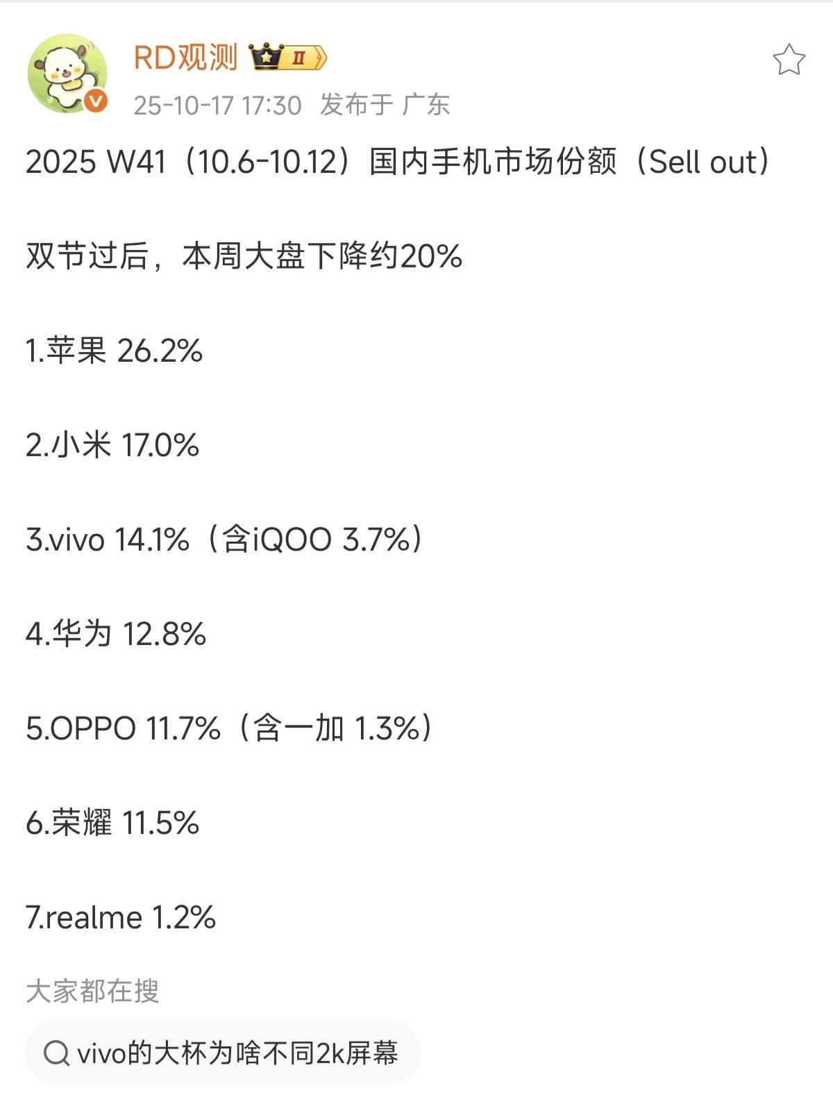 数据出来了 1,苹果26.2% 2,小米17.0% 3,vivo14.1% 4,华为12.8%