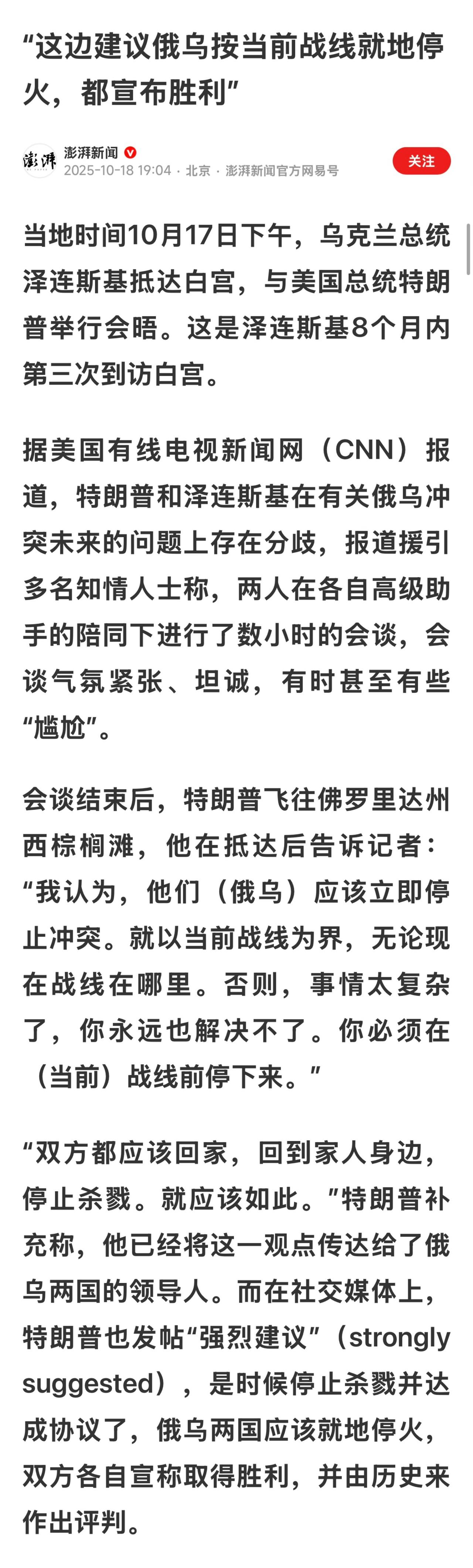 这是个什么方案?折中方案?这个方案双方会同意? 准确地说,这是特朗普就解决俄乌冲突所提出的一项个人提议或主张,但它很难被称作一个完整、可行的“方案”,更接近于一种理想化的、简单的政治表态。被双方接受的可能性微乎其微。