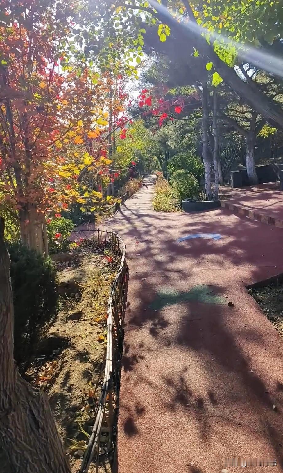 非常喜欢这样的画面,阳光洒在小路上,如梦如幻,万道光芒,特别是在红叶的衬托下,在