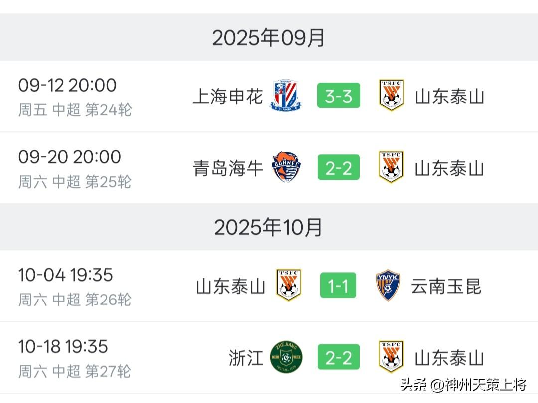 在一场无欲无求的中超联赛中,山东泰山客场二比二与浙江队握手言和。最近两个月4场比