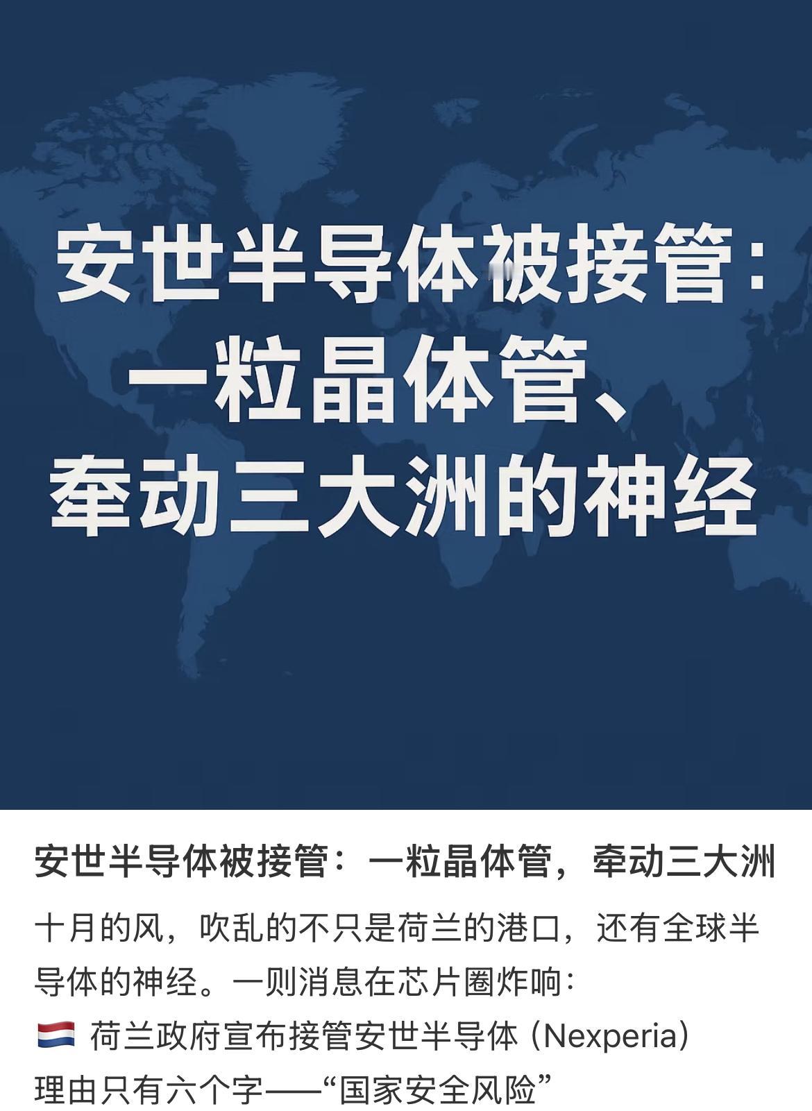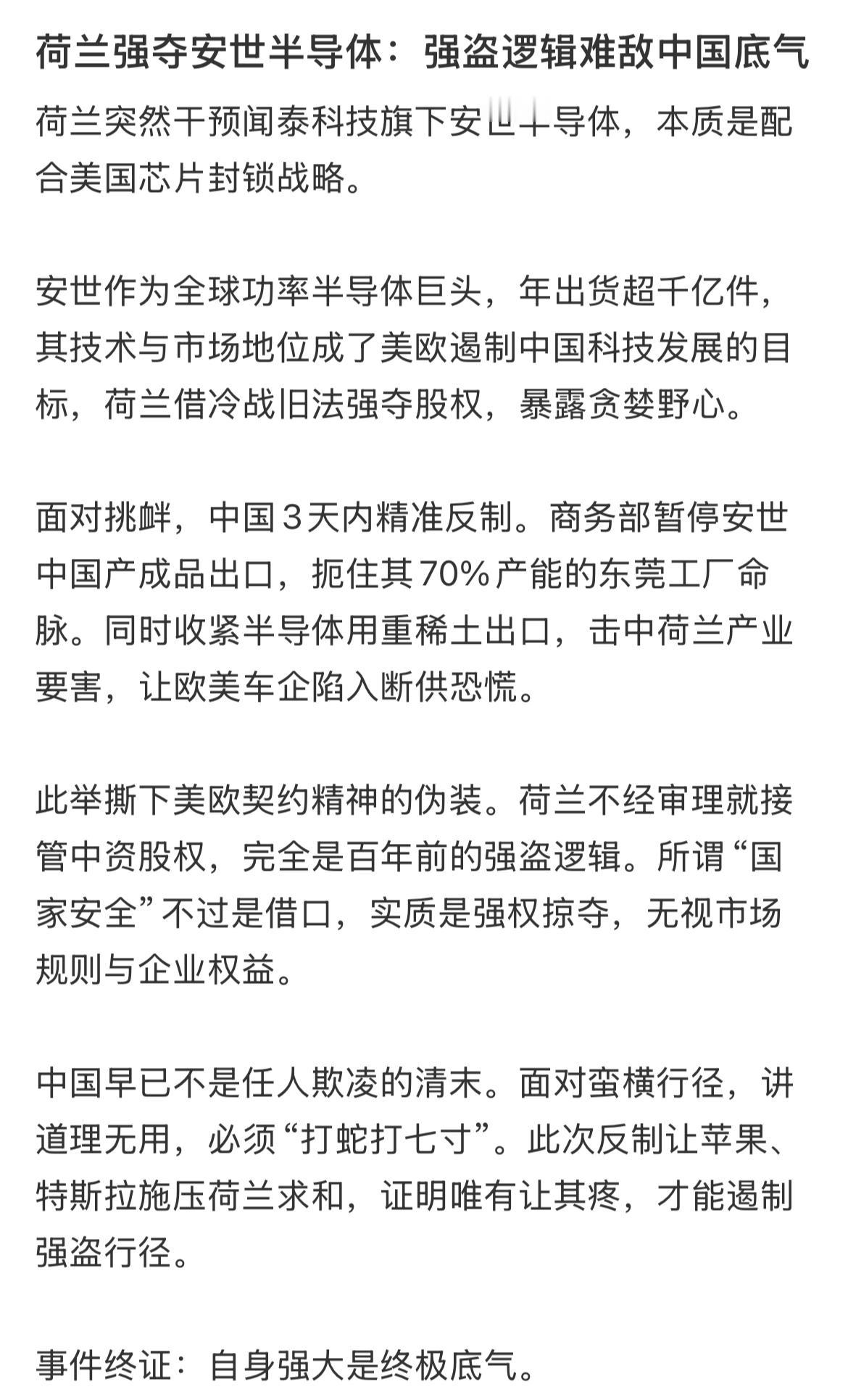 安世荷兰这波操作, 简直是搬起石头砸自己的脚! 发函警告全球客户别买东莞工厂的货… 理由扯什么技术标准和知识产权,这话谁信啊? 要知道,东莞工厂可是扛着安世超过九成的封装测试产能,以前的货全是从这儿出去的,从没听说过有质量问题。 现在突然翻脸,说白了就是想搞事,一边冻结系统、停员工工资,一边又想抢客户,吃相也太难看了。 更可笑的是,它只禁东莞货,让客户转去欧美厂。可换供应商哪那么容易?至少要半年认证,客户生产线停一天损失都是百万级的,博世、特斯拉这些巨头早就急着催货了。 荷兰总部越强硬,越显得自己没底气——没了中国的产能,它手里的股权根本就是空架子。 这事儿彻底说明,全球化产业链里,谁掌握核心产能谁才真的有话语权。你觉得荷兰最后会服软吗?来评论区聊聊~安世半导体公司 安世科技 荷兰供应链 安世半导体 荷兰安世半导体