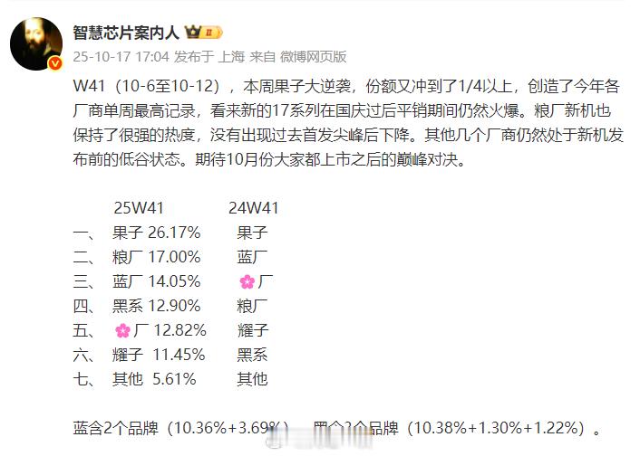 苹果真是……本来十一过后市场会有一个短暂的低谷,还后静候双十一开打。没想到苹果根本无视这个规律,直接把份额干到四分之一还要多。行业人士也讲了,这是今年各品牌单周最高的份额。iPhone 17系列卖爆……