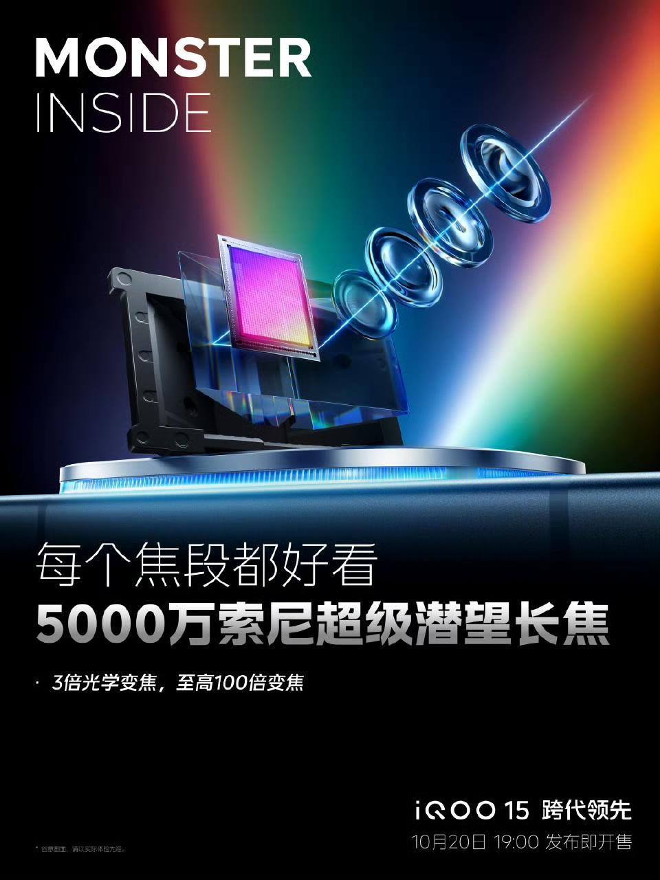 iQOO15定档10月20日发布,官宣了传奇、赛道、凌云和旷野四种配色,还有王者荣耀十周年典藏版,很有个性。 - 骁龙8 Elite Gen5处理器+自研电竞芯片Q3 - 全球首发三星2K LEAD OLED屏、M14发光材料、6000nit峰值亮度、2600nit全局亮度、1000nit手动亮度 - 7000mAh+100W+40W无线 - 50MP+50MP超广角+50MP潜望长焦(3X光学变焦、6倍无损级变焦、100倍数码变焦) - 行业首发0916大体积X/Z轴双向线性马达+1511对称双扬声器、寰宇电竞网络系统2.0