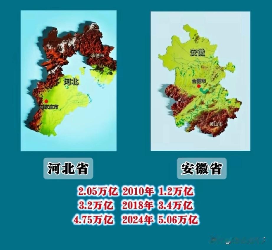 河北省和安徽省,是中国非常典型的2个省份,它们的大哥是北京和上海 中国有34个省级行政单位,其中4个直辖市,5个自治区,23个省,2个特别行政区。 这些省级行政单位里,有两个特别典型的省份,就是河北和安徽,因为它们两个省份背靠两大直辖市北京和上海,这15年来分别走向了不同的发展道路。 2010年的时候,如果把河北省拿出来和安徽省比,河北省都觉得掉价,那时候河北gdp2.05万亿,排名全国第7,安徽gdp1.2万亿,排名全国第13名,根本就不是一个档次。 2018年,安徽反超河北。 2024年河北gdp4.75万亿,安徽gdp5.06万亿,安徽人均gdp排名第13名,河北人均GDP掉到了26名。 大家默认京津冀里,北京是老大,长三角沪苏浙皖里,上海是老大,北京虹吸周边,上海辐射周边。 这15年,河北和安徽背靠着北京和上海,完全走上了不同发展道路。安徽经济排名 安徽GDP 河北城市排行 江苏安徽