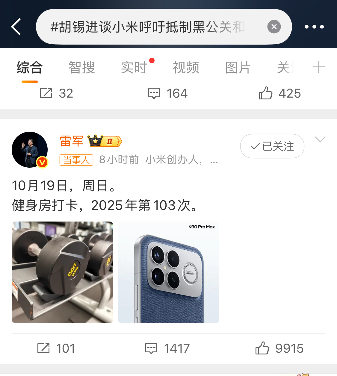 胡锡进谈小米呼吁抵制黑公关和水军雷总不语,健身打卡,积极生活。