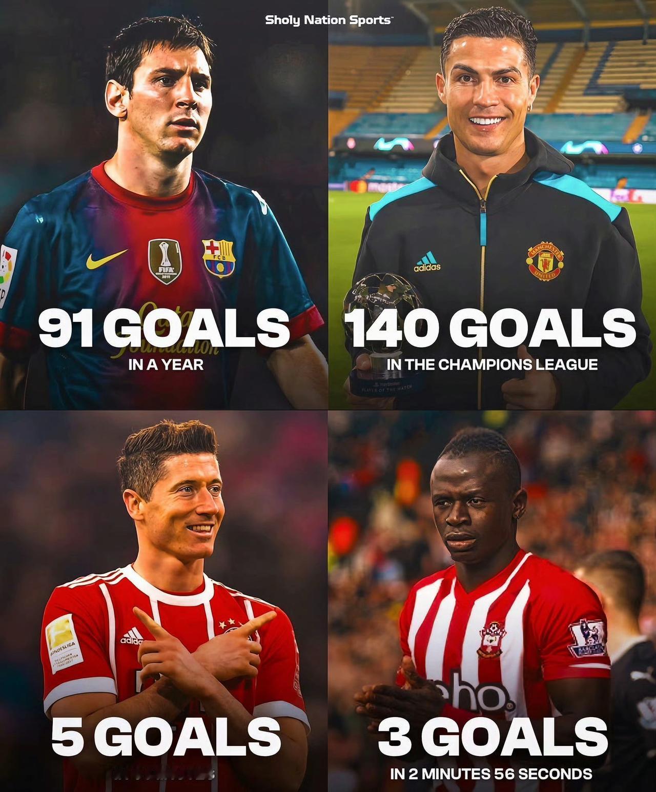 以下哪个记录最难打破? 梅西:一年之内打进91个球 C罗:欧冠一共打进140个球 莱万:9分钟内打进5个球 马内:2分56秒完成帽子戏法