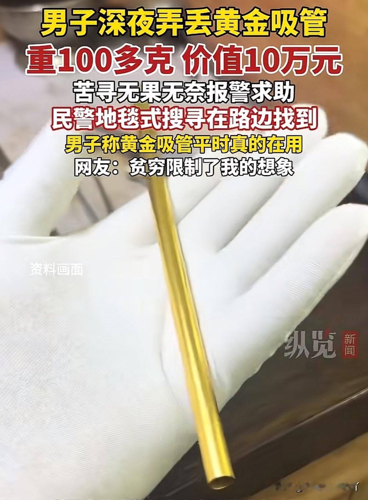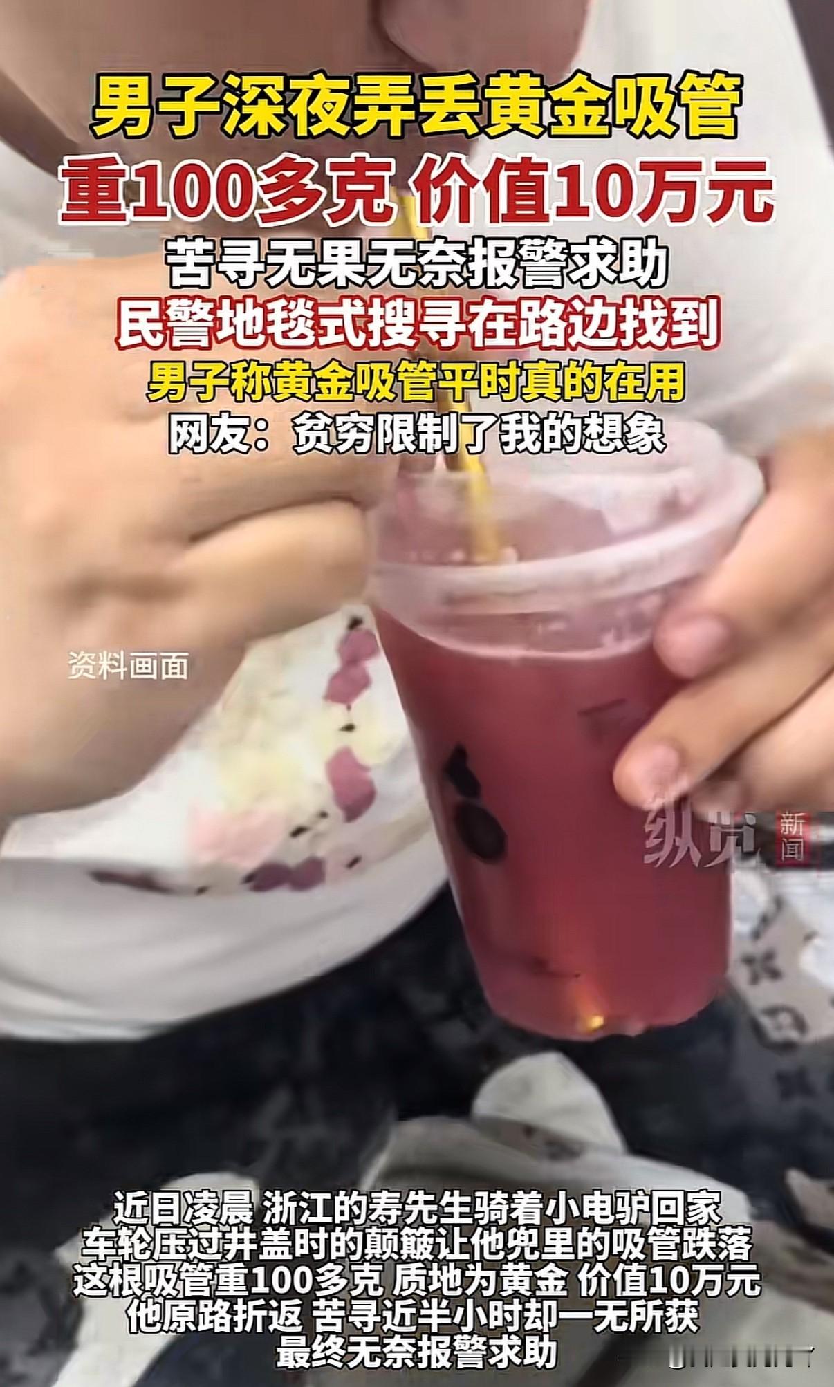 贫穷限制你我的想象!有钱人喝奶茶的吸管都是用100多克的黄金打造 杭州一男子因为喜欢喝奶茶,为此专门找工匠使用100多克足金为自己打造了一根独一无二的“奶茶专用吸管”。男子表示还有一根是用银子打造的,一金一银两根吸管他都经常使用,这次外出喝奶茶带的是用黄金打造的,喝完骑小电驴回家因路上颠簸吸管从口袋里掉出去,回家后发现立刻原路返回寻找,找了近半个小时找不到只能报帽子叔叔 警方在接到男子求助后经过地毯式搜寻最终在路边找到,虽然有几处被磕变形 有钱人真骚包[皱眉]