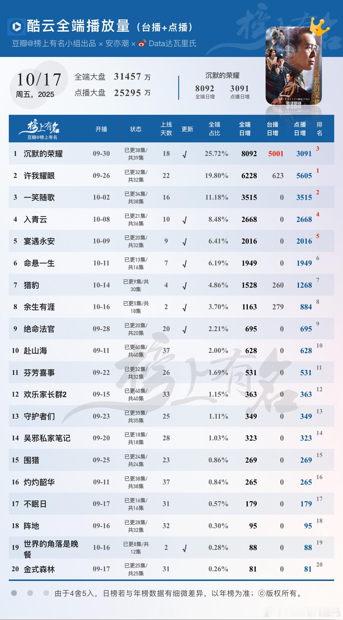 电视剧沉默的荣耀酷云全端播放量破亿❗️点播端2989