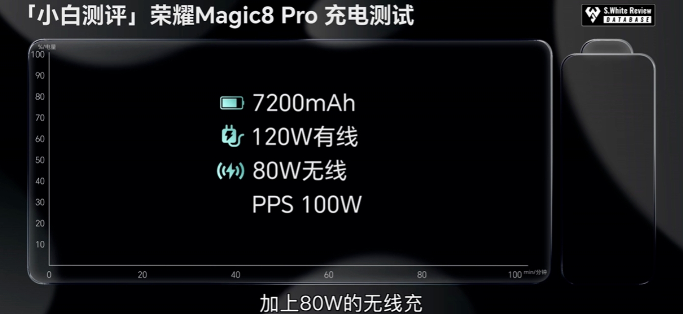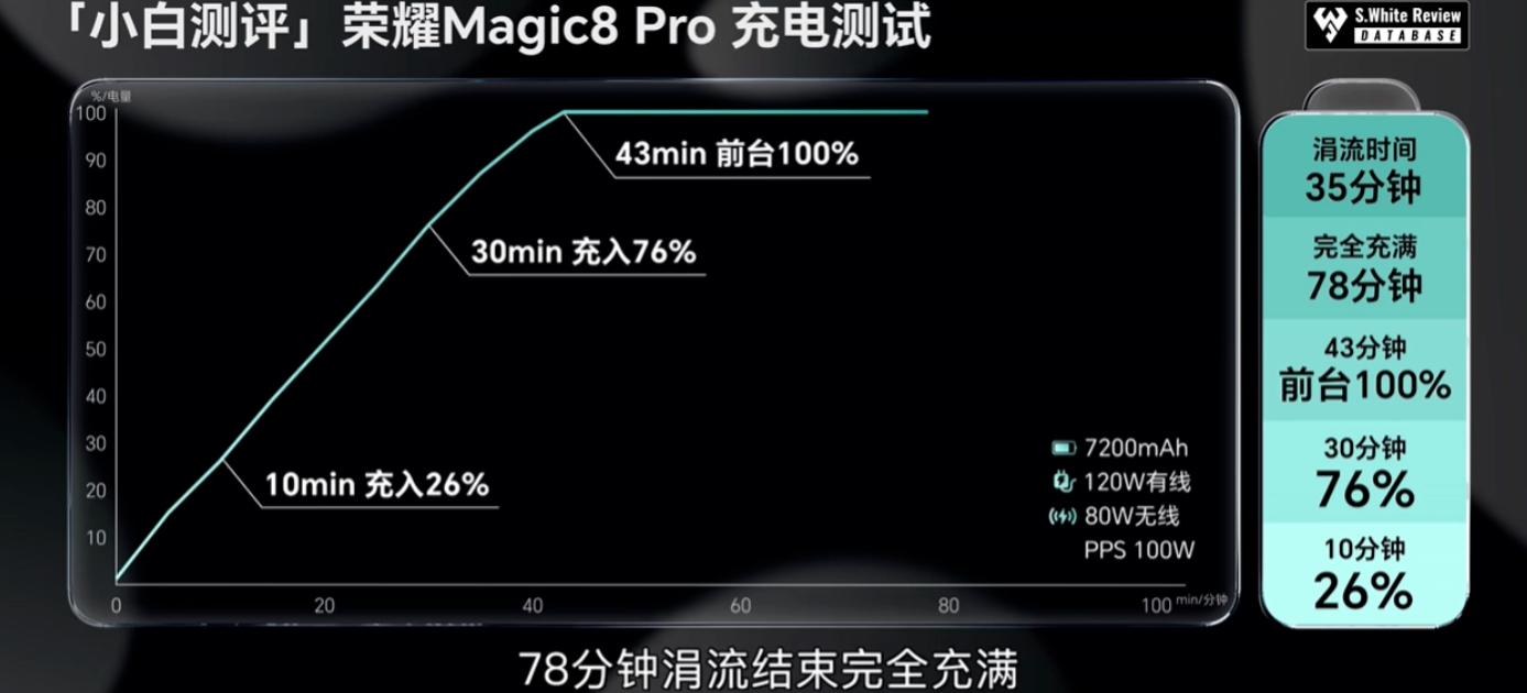 充电方面,荣耀Magic8 Pro搭载了120W有线和80W无线充电,小白实测10分钟充电26%,30分钟充电76%,43分钟充到100%,这个充电速度怎么样?毕竟是7200mAh的大电池。