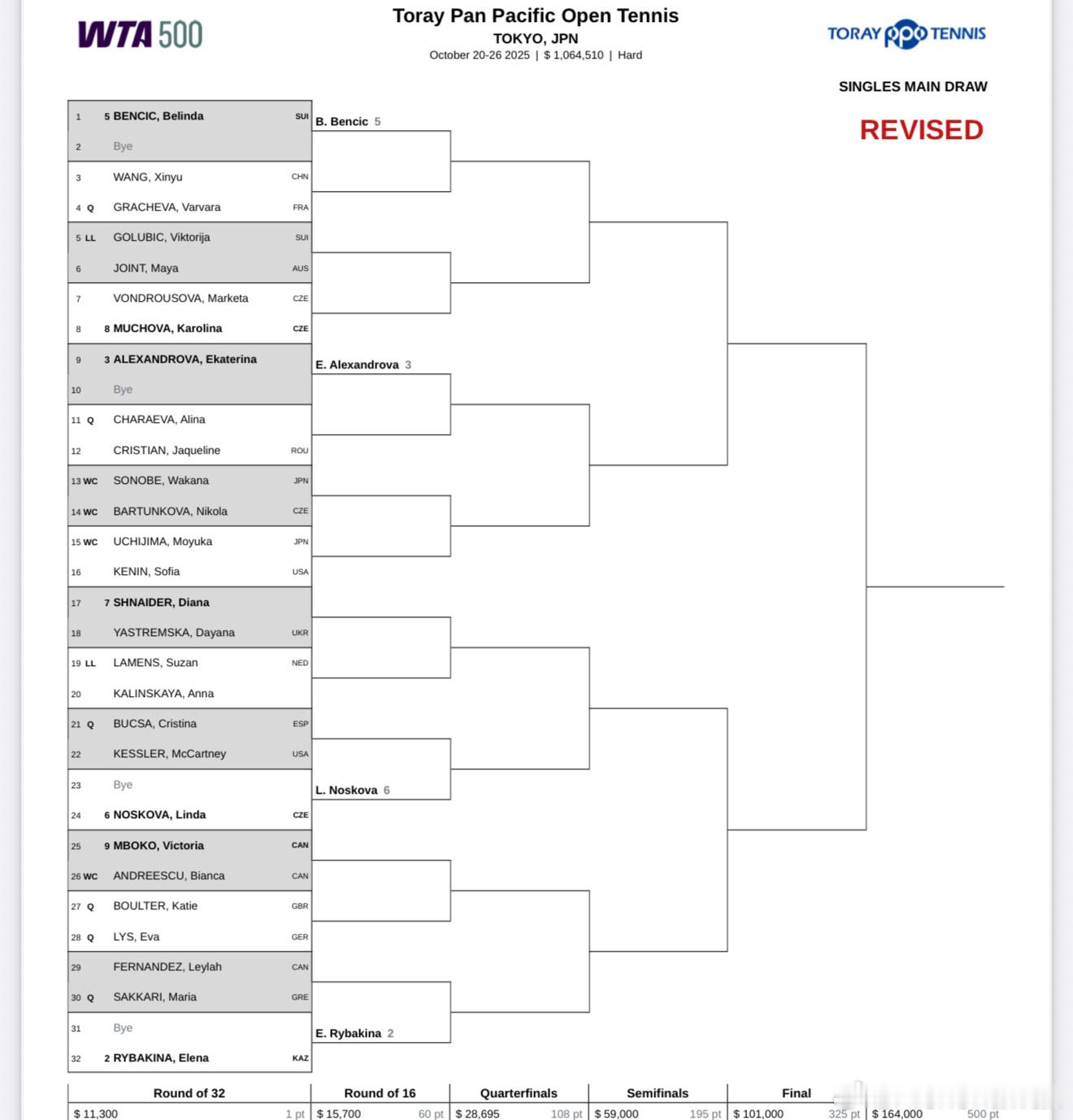 东京站单打签表也出来了,莱巴金娜2号种子镇守下半区首轮轮空,第二轮将面对费尔南德斯和萨卡里之间的胜者,潜在的对手都不弱,娜娜一步一步来。网球talking大会