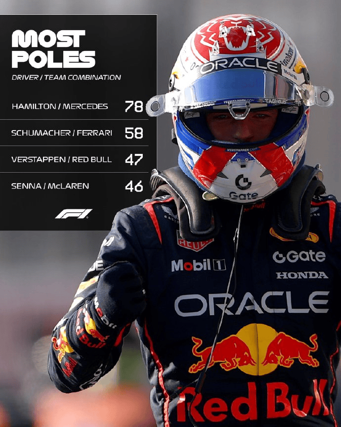 这是维斯塔潘为红牛车队夺得的第47个杆位,超越了埃尔顿-塞纳为迈凯伦车队夺得的46个杆位的纪录,这意味着这位荷兰车手现在仅落后于迈克尔-舒马赫为法拉利车队夺得的58个杆位,和刘易斯-汉密尔顿为梅赛德斯车队夺得的78个杆位,在车手与车队组合夺杆数排行榜上位居前列。
