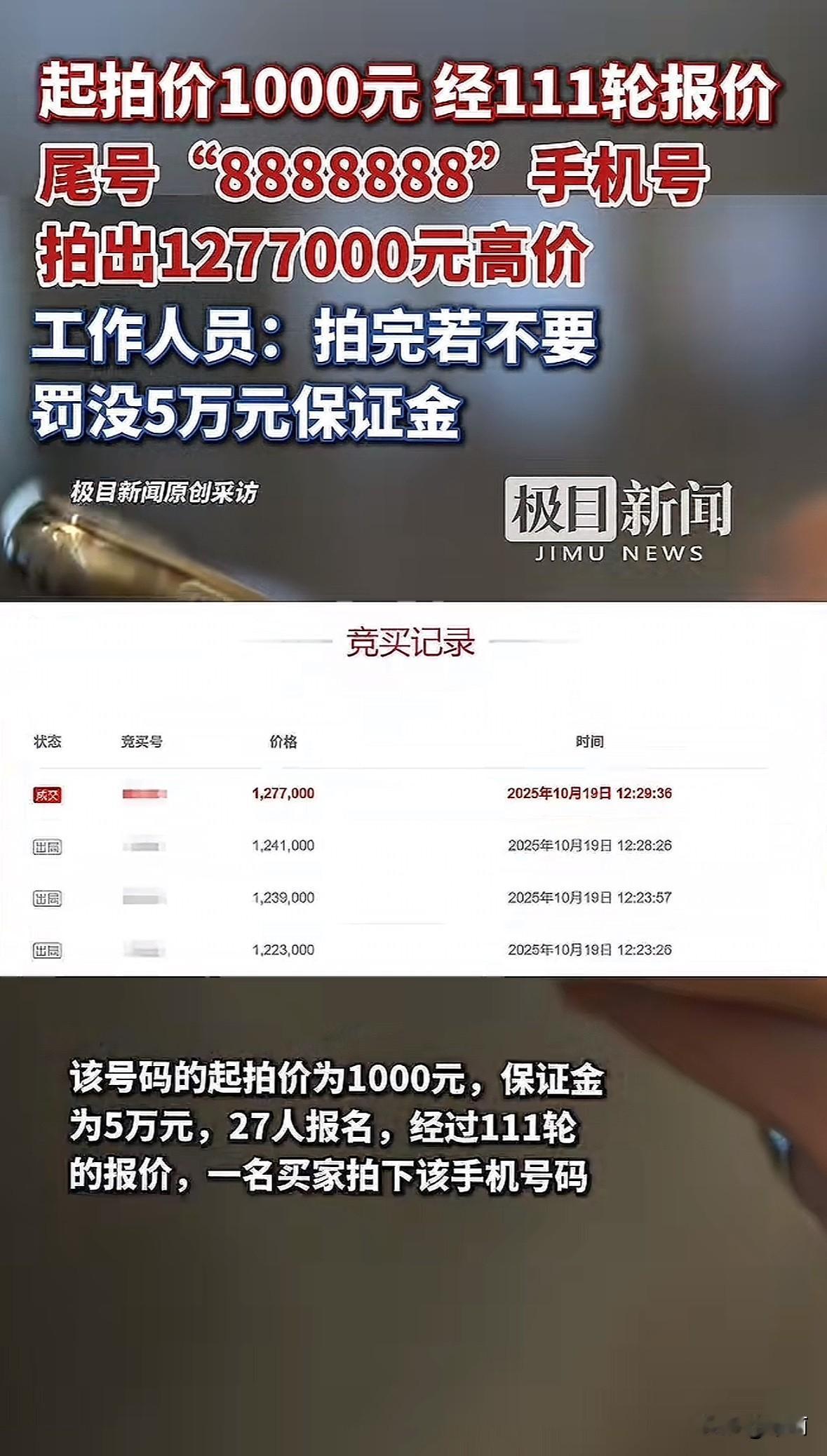 一个广州移动尾号“8888888”的手机号,在阿里资产平台拍出127.7万元。 起拍价才1000元,27人报名抢,经过111轮报价才成交。号码月租38元,过户后没最低消费年限,拍不下单会罚没5万保证金。 有人觉得这钱花得值,生意人看重靓号当“隐形名片”,彰显实力还方便客户记。也有人不理解,现在都用微信联系,谁还特意记手机号。 其实天价靓号火,无非是稀缺性和数字寓意在撑着。但得想明白,手机号本质是通信工具,而且咱们只有使用权,没有所有权。花上百万买个号码,到底是刚需还是虚荣心,全看个人选择。