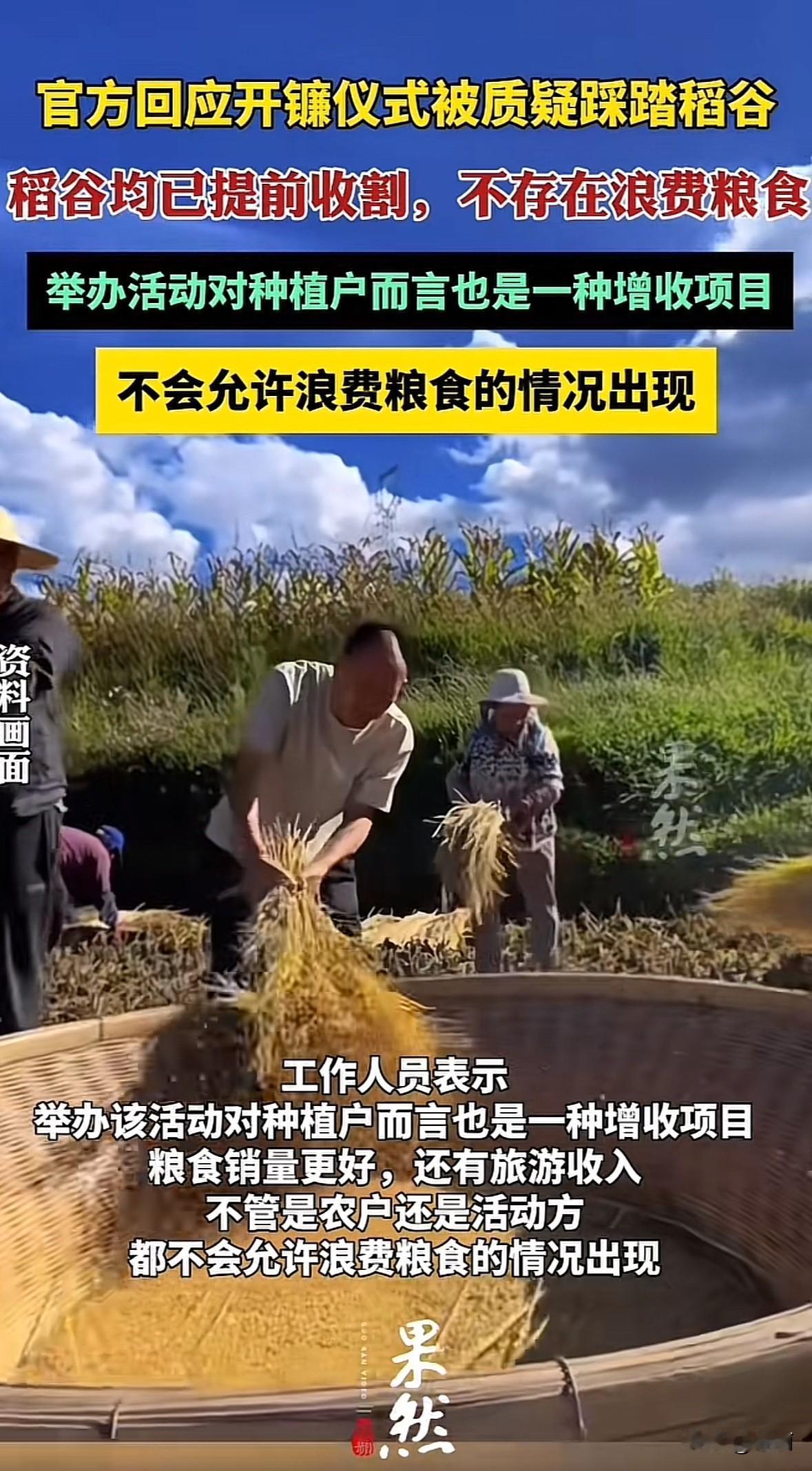 10月18日,宁波象山县一个开镰仪式上,有人在稻田里的舞台表演瑜伽,舞台周围还有稻穗,网友看着视频质疑这是踩踏稻谷、浪费粮食。 10月19日镇政府回应了,说活动用的区域和通道早把稻谷收割了,仪式结束后整片稻田也都会收,不存在浪费。工作人员还说,这是农旅融合的活动,能帮种植户多赚钱,粮食卖得好还有旅游收入,农户和活动方都不会允许浪费粮食的情况出现。 网友质疑是出于爱惜粮食的本心,毕竟之前有过游客乱踩稻田的事,大家对糟蹋粮食的行为很敏感。但象山县这次提前做了收割准备,既办了活动又没浪费,这种农旅结合的方式其实是把粮食和风景都利用好了,只要规划到位,完全能双赢。