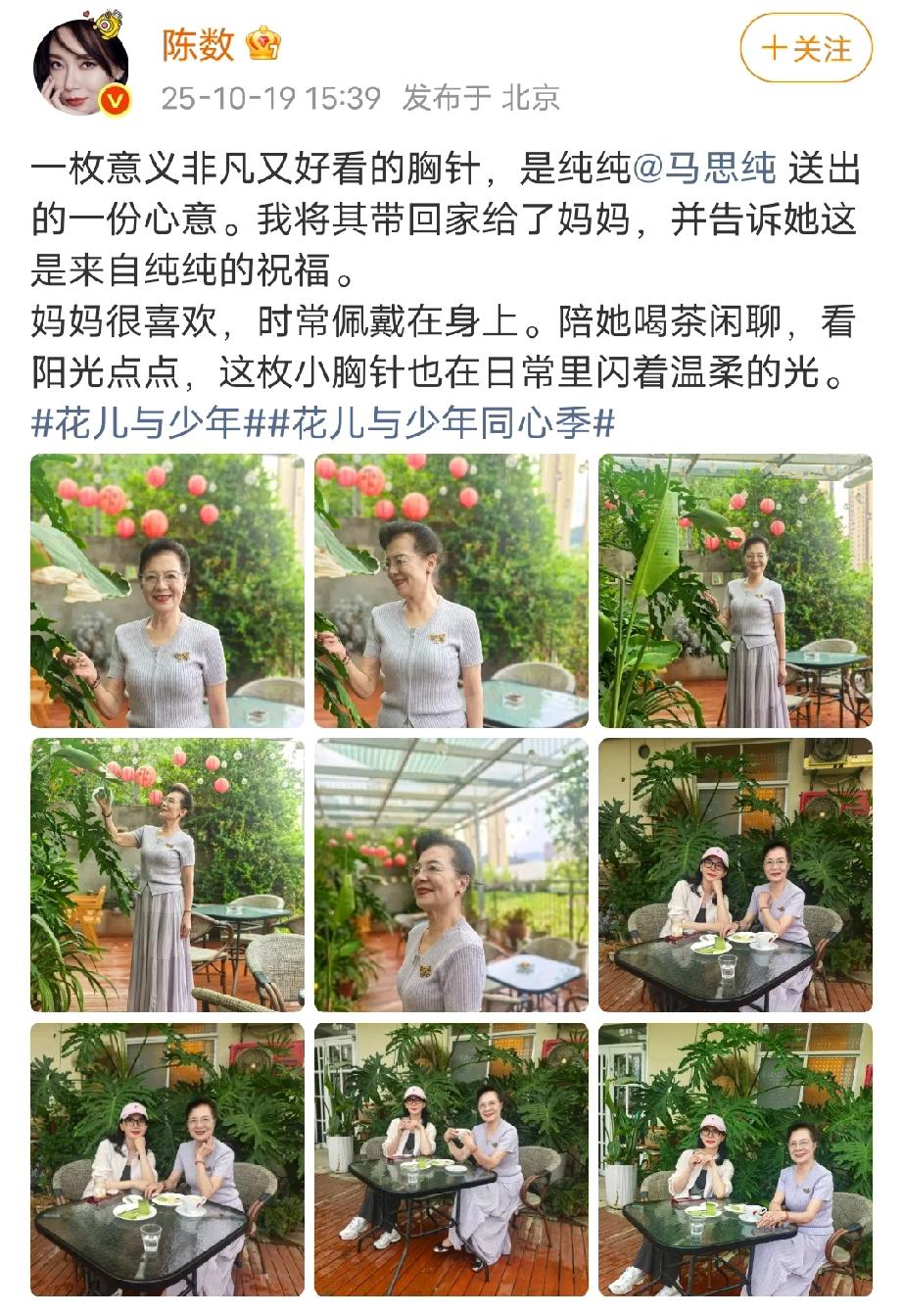 48岁陈数和80岁老母亲喝茶闲聊,陈数妈妈真是又美又年轻,80岁还是依旧保持优雅,穿衣打扮端庄大气,还有化妆的习惯,原来自律又好气质的陈数是随了妈妈。 陈数称自己将马思纯送的胸针带回家送给了妈妈,陈数妈妈经常拿出来戴,胸针是鎏金工艺,还有花朵蜜蜂元素,很有灵动感。 陈数和妈妈同框,母女俩长得真的好像,感觉陈数妈妈比女儿还会打扮。