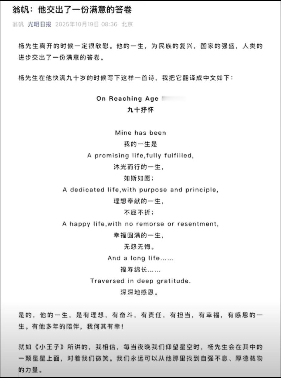 翁帆发文看哭了!杨振宁这首诗道尽一生,原来最好的人生是这样的 谁没刷到翁帆悼念杨振宁先生的文章?没有华丽辞藻,却看得人鼻子发酸——这才是最动人的纪念啊! 103岁的杨先生走了,翁帆在文中说他"为民族复兴、国家强盛交出了满意答卷",还翻出了先生九十岁时写的诗 。那句"沐光而行,如斯如愿;理想奉献,不屈不折",简直就是先生一生的写照!没有晦涩的物理公式,却把"自强不息"四个字说得明明白白。 以前总听人讨论他们的感情,现在才懂,最好的陪伴就是这样:你追你的科学星,我守我们的小日子,最后笑着说句"何其有幸"。翁帆还说,觉得杨先生就在某颗星星上微笑,这浪漫劲儿,比偶像剧好哭多了 。 其实咱们普通人的人生也一样,不用非得成为大家,能像杨先生说的那样"无怨无悔,懂得感恩",就算没白来一趟。这种踏实奋斗、心怀家国的劲儿,才是真·正能量吧? 读杨先生的《九十抒怀》,哪一句戳中了你?你觉得"圆满的人生"该是什么样的?评论区聊聊~ 杨振宁逝世 翁帆发文悼念杨振宁