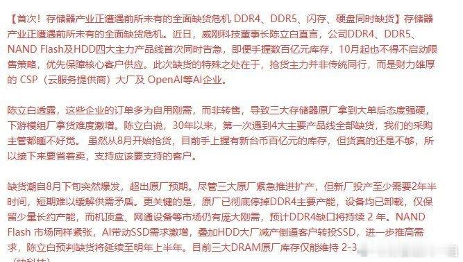 存储器产业正遭遇前所未有的全面缺货危机 DDR4、DDR5、闪存、硬盘同时缺货。