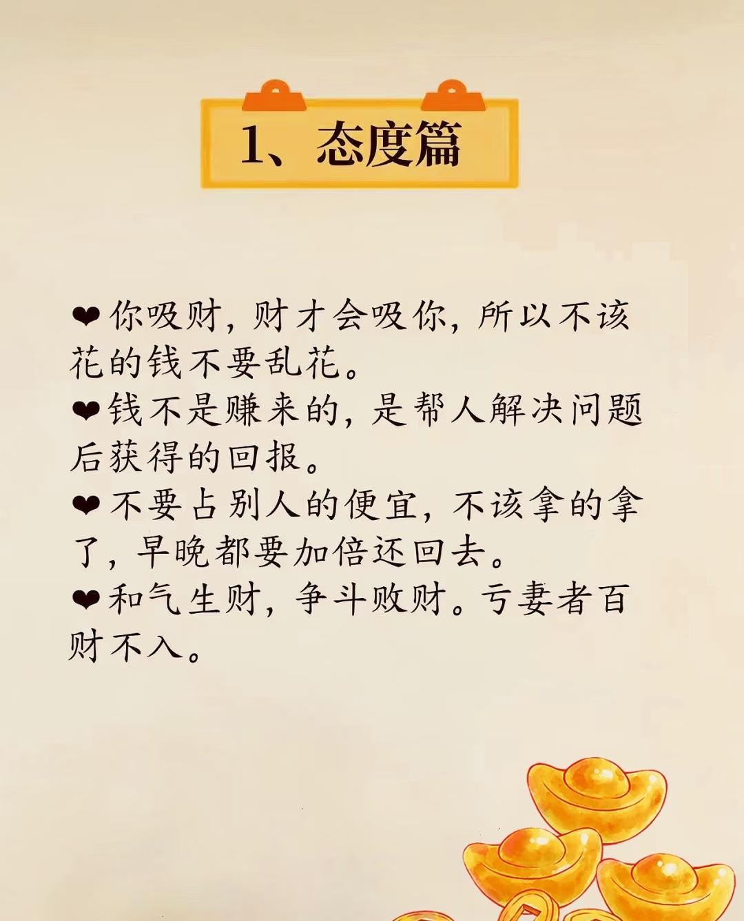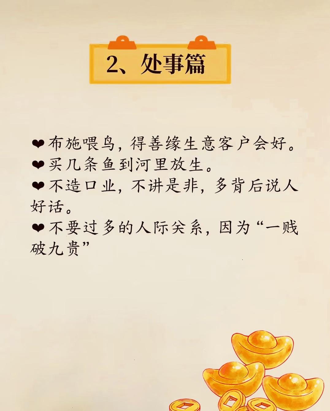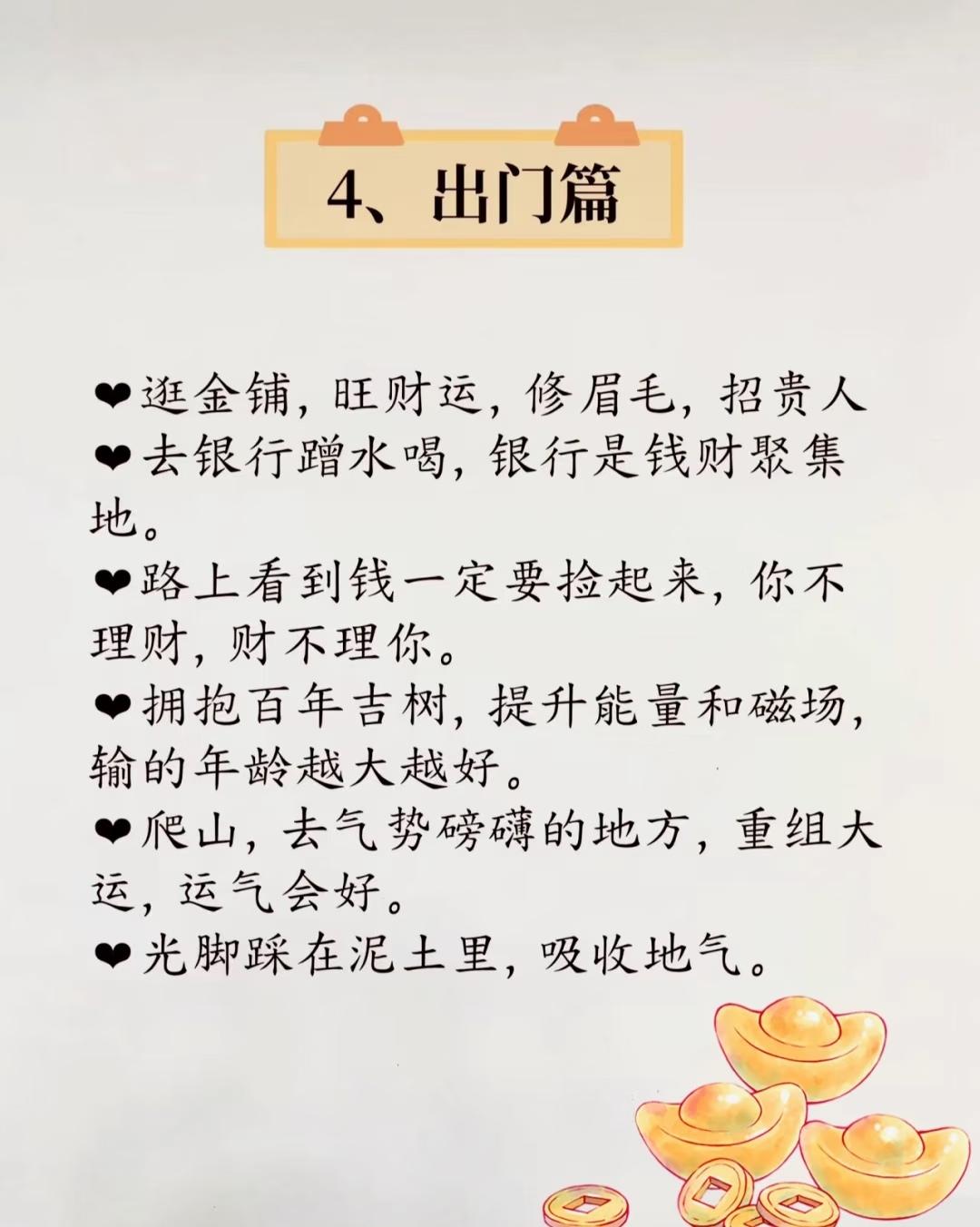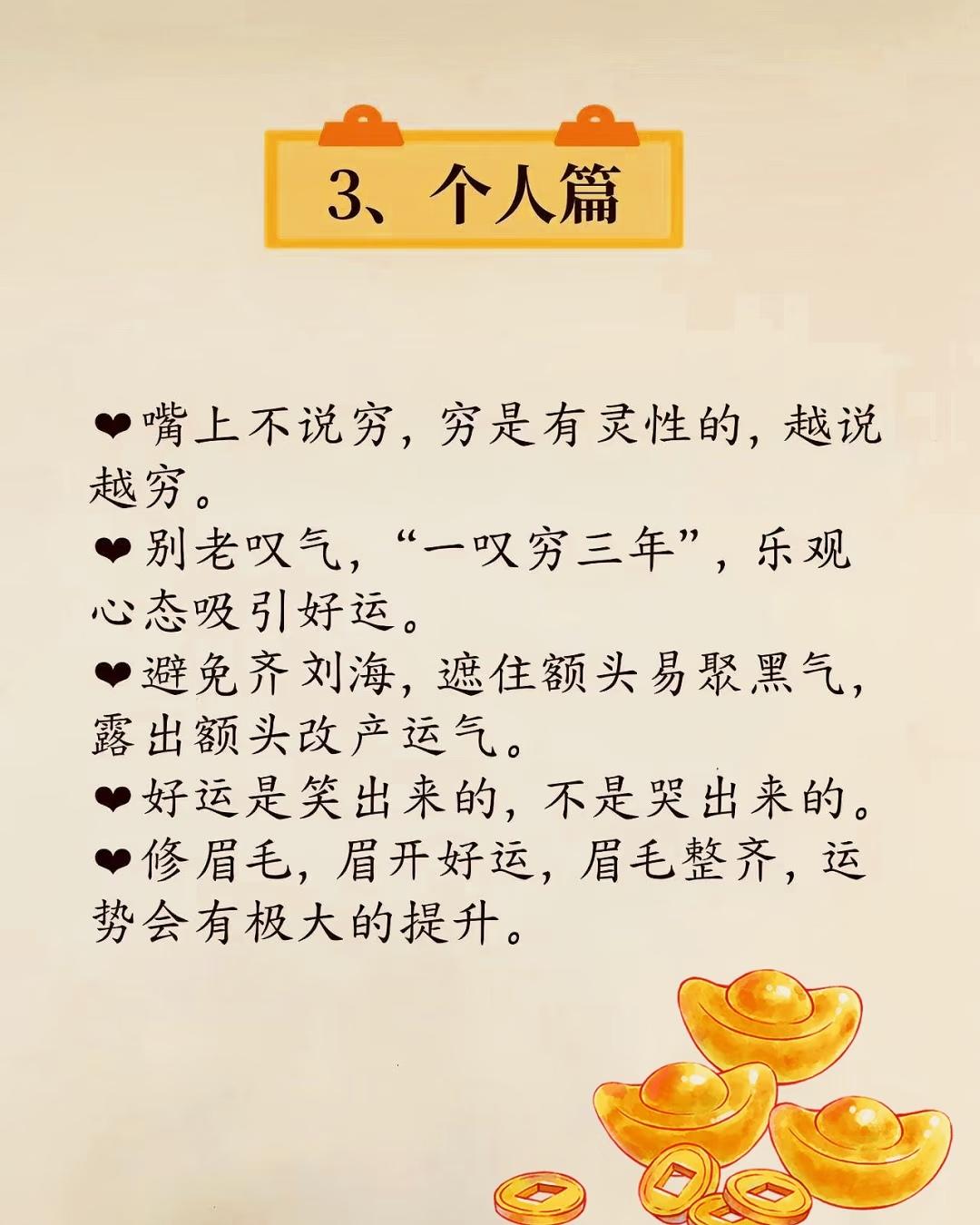 “提升财运与个人运势”: 🌟 总结主题:提升财运与个人好运的实用习惯指南 一、【态度篇】—— 财富源于正向心态与价值观 (对应第2张图) 核心思想:树立正确的财富观与人生态度,才能吸引财富。 - ✅ 你吸财,财才会吸你:财富是有磁场的,积极吸引才能获得回馈。 - 💰 钱是解决问题的回报:不是单纯“赚来”的,而是你为他人创造价值后的自然结果。 - ⚖️ 不占便宜,有舍有得:不该拿的不拿,贪小便宜可能带来更大损失。 - 🤝 和气才能生财:争斗、亏待家人(尤其伴侣)都会影响财运。 🔮 插图元素:底部金元宝,强化财富意象。 二、【处事篇】—— 善行与良好人际关系助旺财运 核心思想:积德行善、谨言慎行、精简社交,有助于积累人脉与福报,间接带动财运。 - 🐦 布施喂鸟,积累善缘:小善举也能带来生意与客户的良性循环。 - 🐟 放生鱼类,广结善缘:传统民俗中认为放生能带来福报。 - 🤐 不造口业,不议论是非:多说好话,尤其背后夸人,能积累正能量。 - 👥 精简人际关系:引用俗语“一贱破九贵”,提醒远离低能量人群。 🔮 底部金元宝与古钱币插画,寓意行事端正带来财富好运。 三、【个人篇】—— 改善个人形象与习惯,提升自身气场 核心思想:外在形象与日常习惯,会影响个人磁场与“运气流动”。 - 💬 嘴上不说穷,越说越穷:语言具有心理暗示作用,避免负面自我定义。 - 😤 别老叹气,“一叹穷三年”:保持乐观,叹气会带来消极气场。 - 💇 避免齐刘海,露出额头:传统观念认为额头代表运势,遮挡易聚“黑气”。 - 😊 好运是笑出来的:积极情绪吸引好运,笑容是最好的转运符。 - 🪮 修眉毛,提升运势:整齐干净的眉毛被认为能带来好运气。 🔮 底部金元宝铜钱图案,点明主题仍围绕“财运”展开。 四、【出门篇】—— 外出时的“吸财旺运”小窍门 核心思想:通过特定外出行为,接触正能量场所或自然能量,提升个人运势与财运。 - 🏦 逛金铺 / 修眉毛:金铺为财富聚集地,修眉又招贵人。 - 🏦 去银行蹭水喝:银行为“财气”汇聚之处,借地气旺自己。 - 🪙 见到钱就捡:象征主动把握财运,不拒绝财富机会。 - 🌳 拥抱百年吉树:大树有强大能量场,可提升个人磁场,尤其是年长者收益更大。 - 🏔️ 爬山 / 去气势磅礴的地方:大自然的雄伟能“重组大运”,改变气运轨迹。 - 🌍 光脚踩泥土,吸收地气:接地气能带来踏实、稳定的能量,有助于运势扎根。 🔮 底部金元宝与铜钱卡通图案,呼应主题,增强趣味性与吉祥感。 ✅ 总体核心理念提炼: 维度 核心关键词 作用 心态 吸财、正向思维、不贪小便宜 吸引财富的基础心态 行为 布施、善行、不造口业 积累福报,间接旺财 形象 修眉、不叹气、不说穷 改善个人气场与吸引力 环境 金铺、银行、吉树、大山、土地 借助外部环境能量提升运势