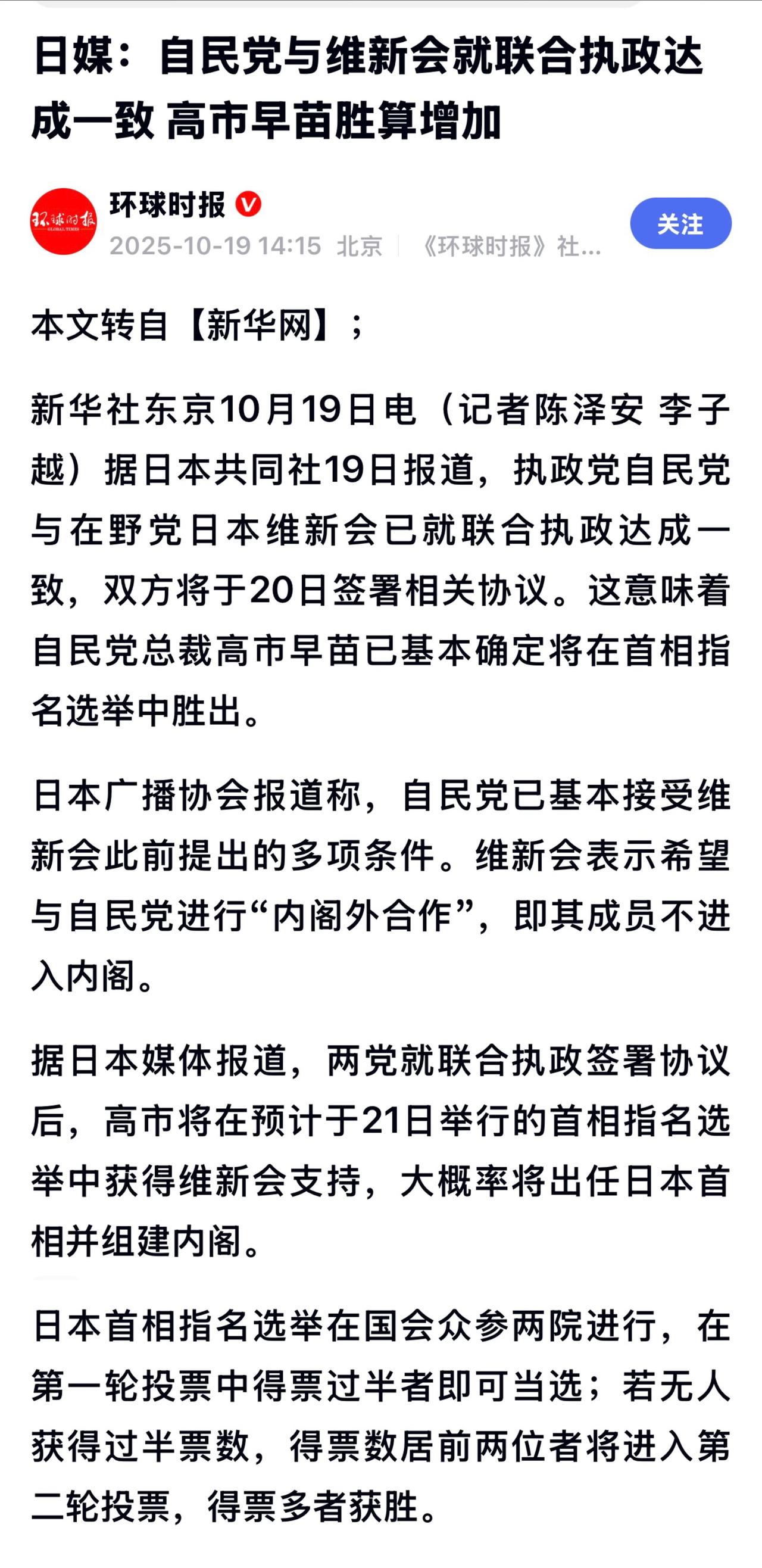 日本自民党在众议院的196票加上维新党的35票,总数可达231票,距离过半所需的233票仅差两票。若自民党再争取到一个小党或少数议员支持,高市将有望在首轮投票中顺利当选。