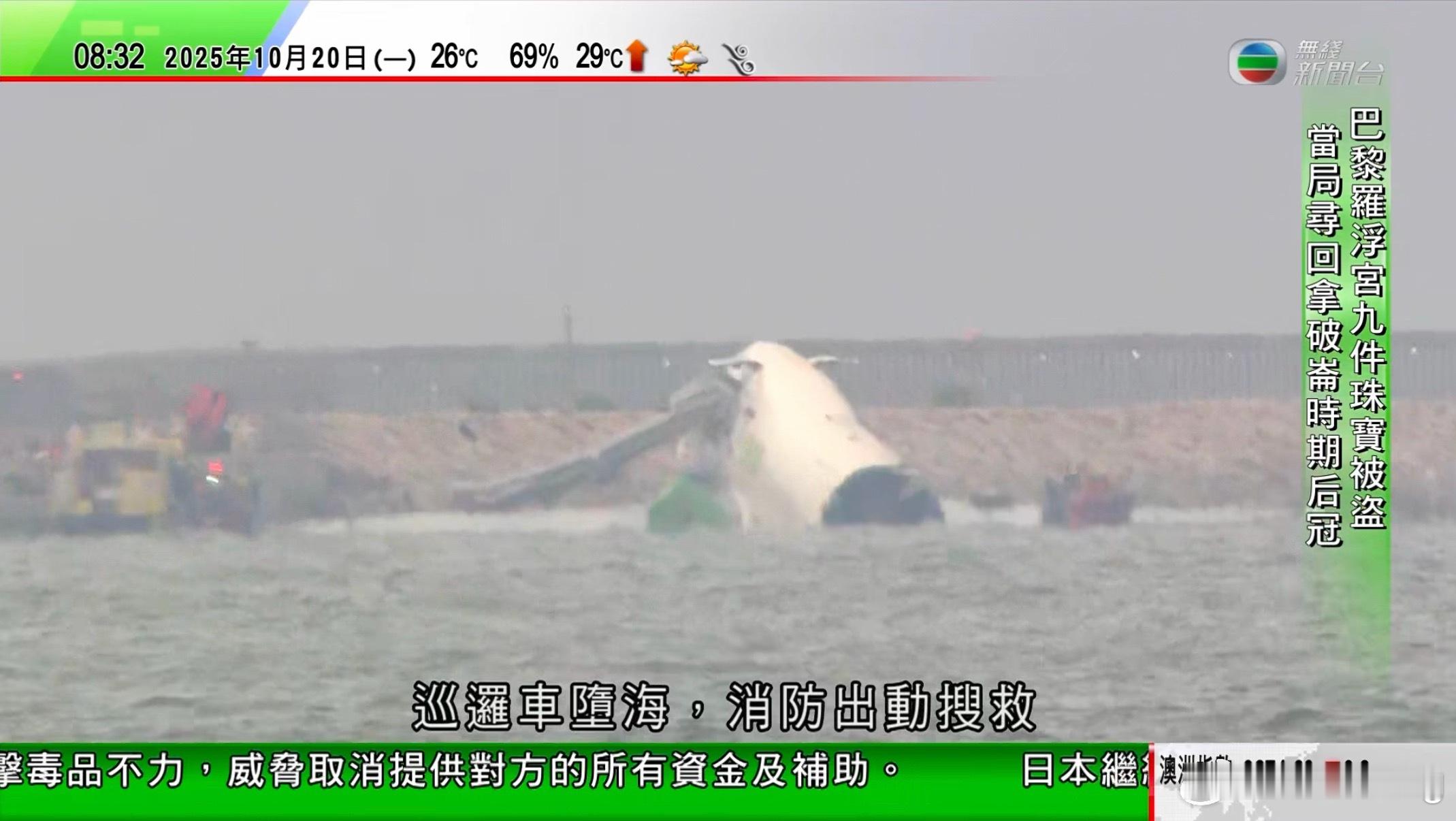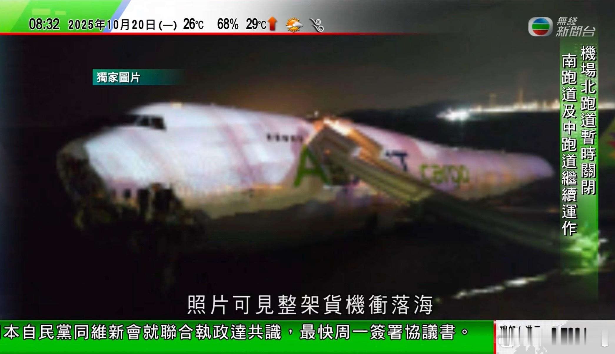 从迪拜飞来香港的货机降落时候冲出跑道,并且撞上地面地勤车掉落在海里,飞机上的机组
