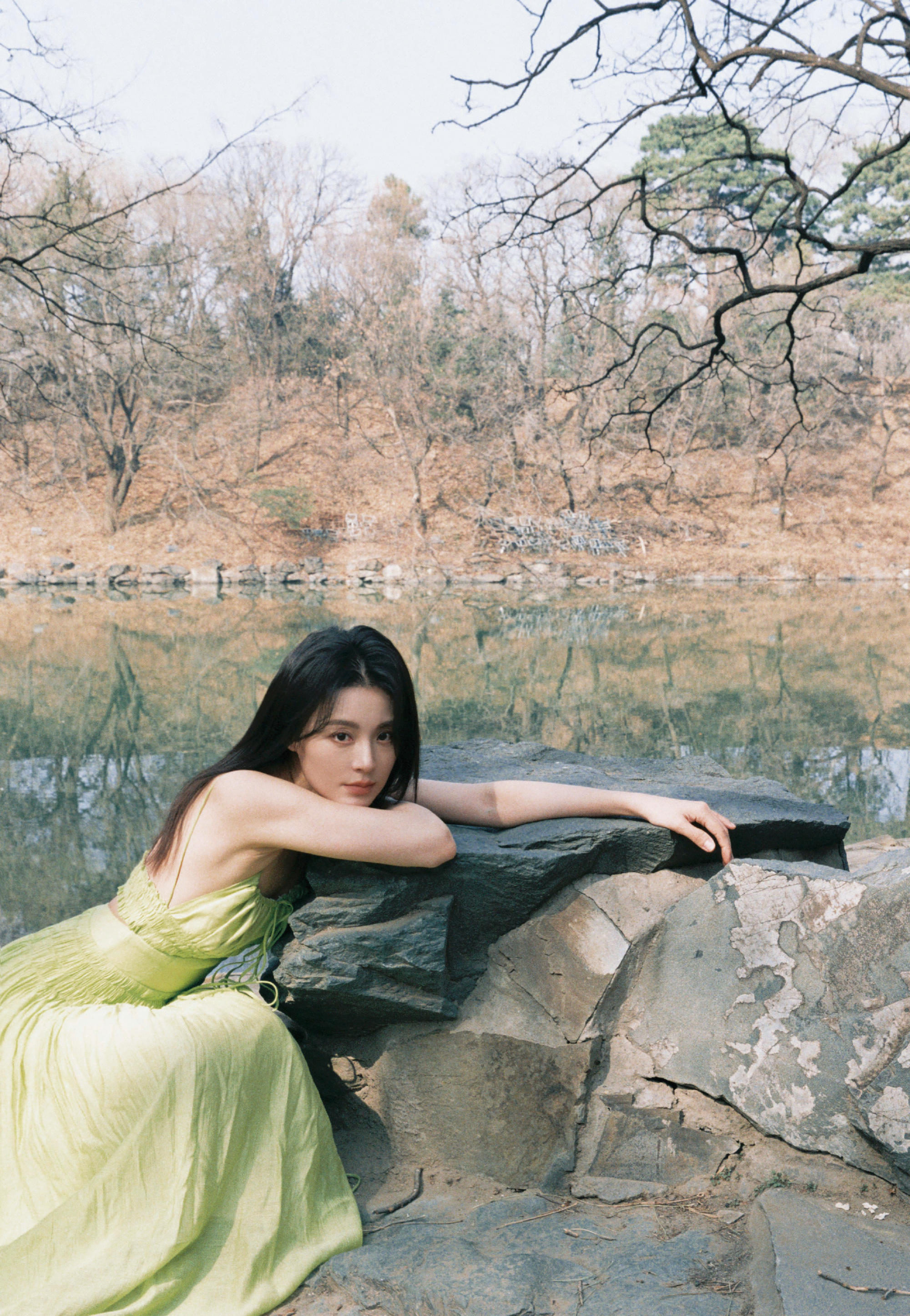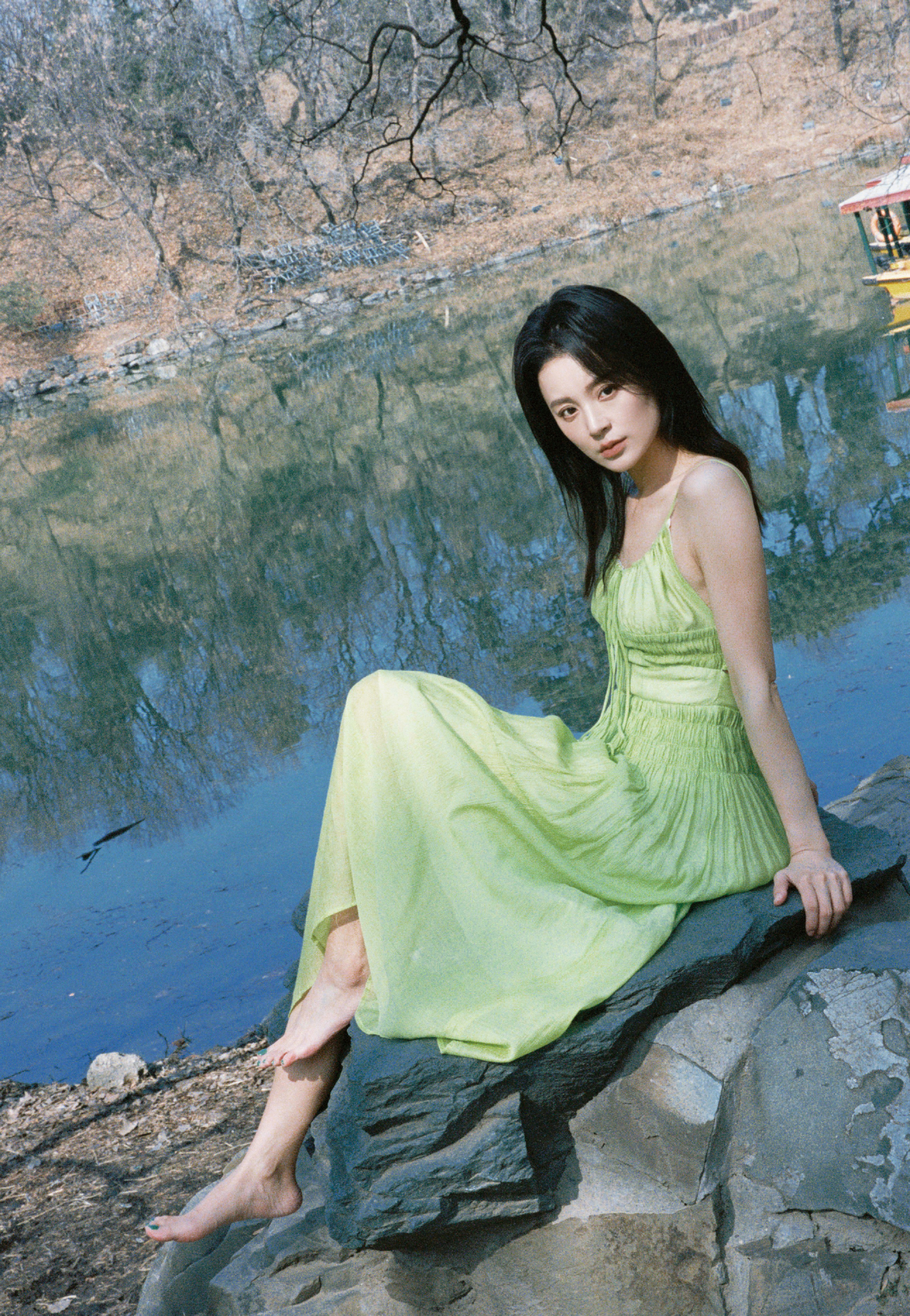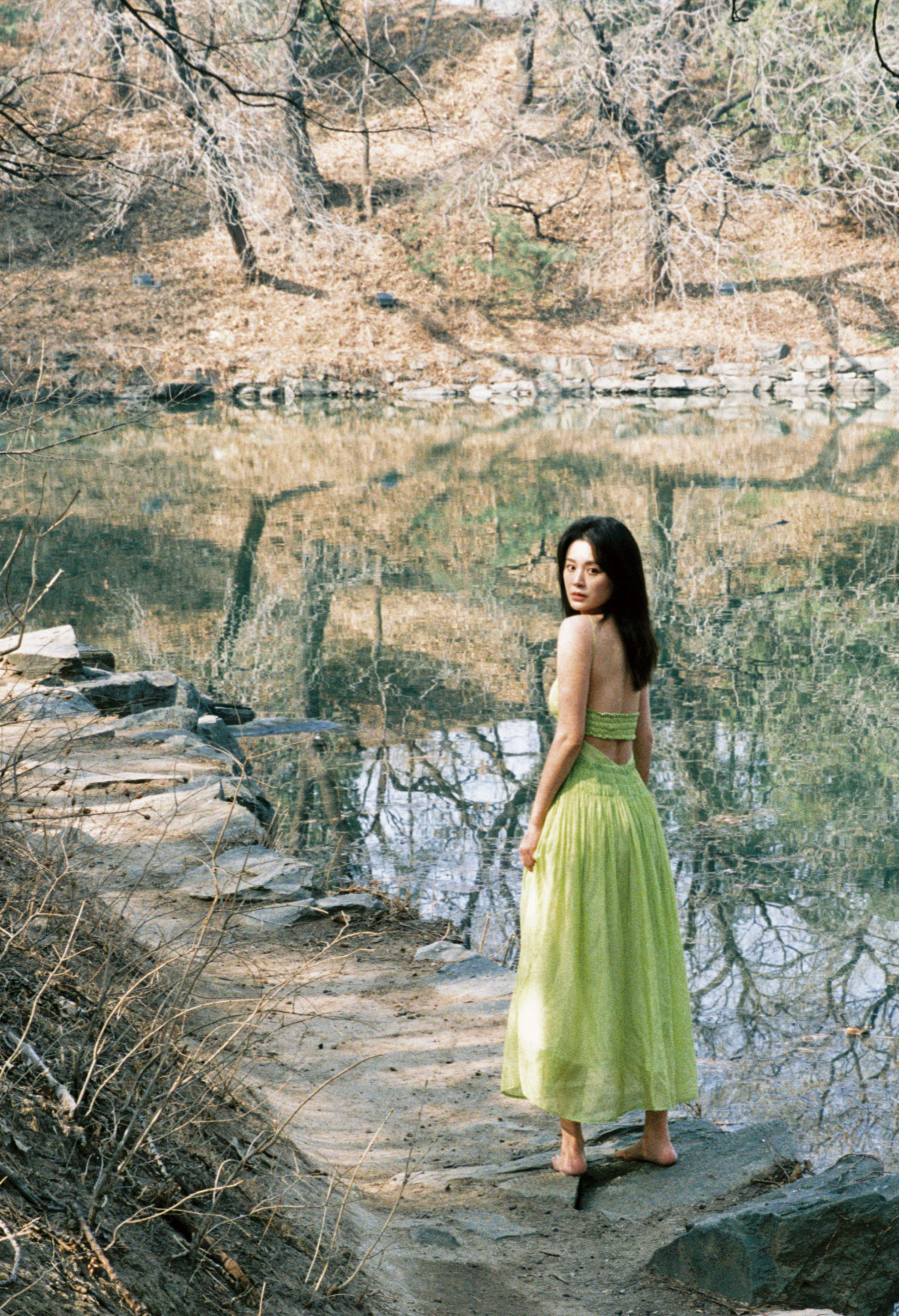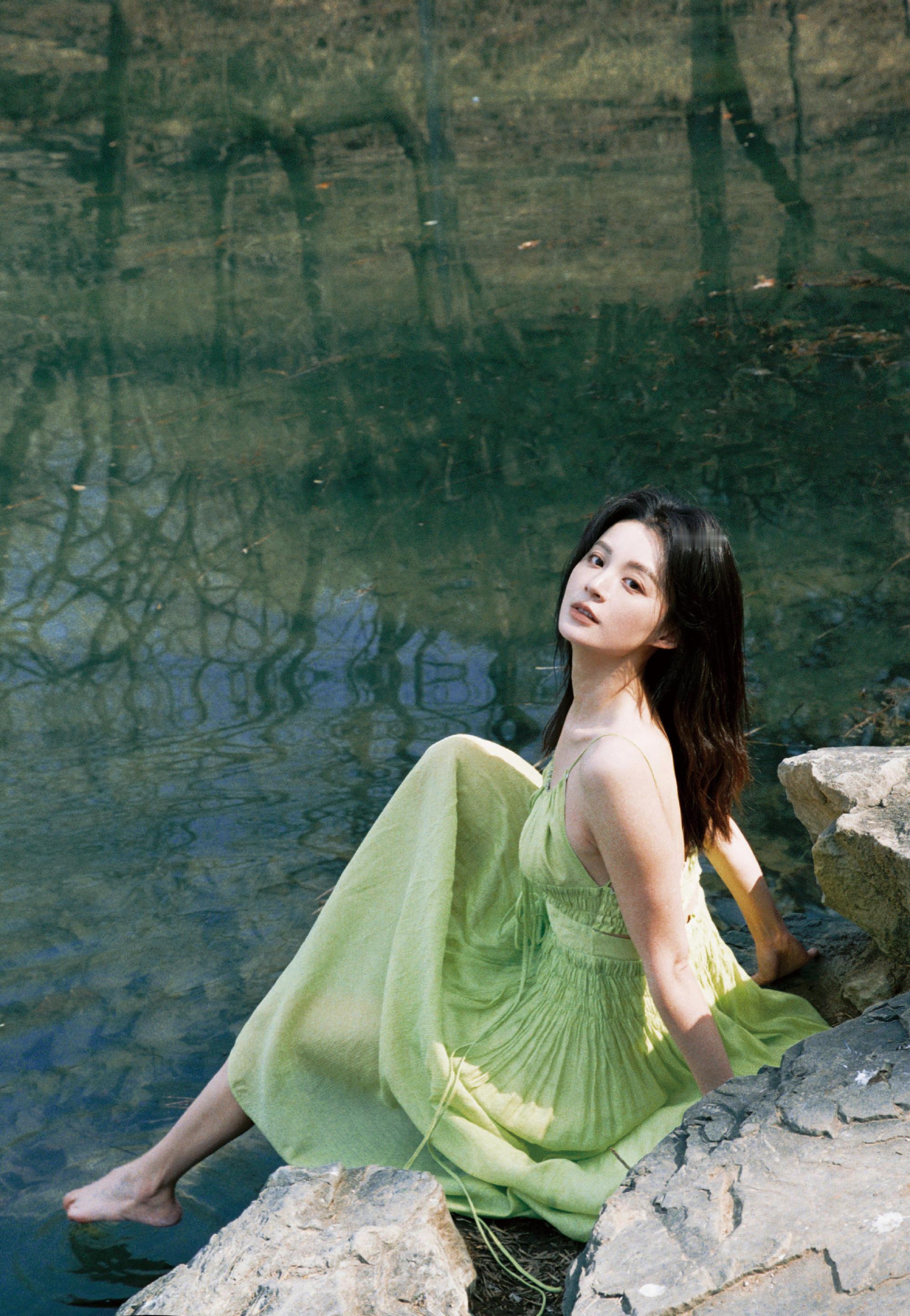 毛林林秋日氛围大赏,绿意纱裙,绿植岸边,意境满满