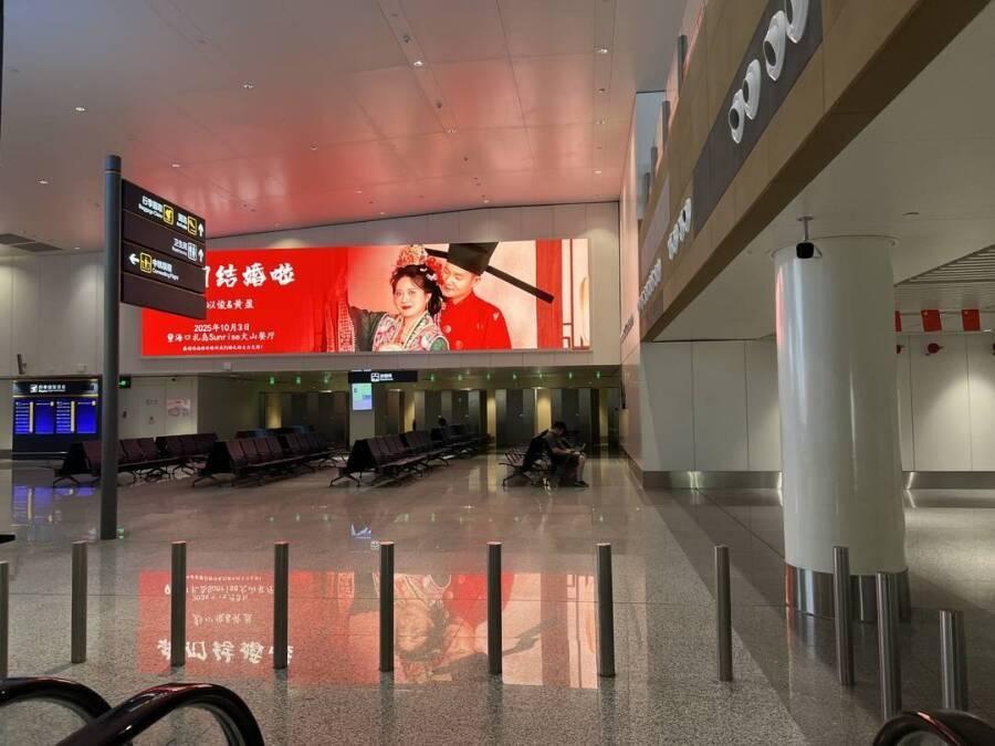 国庆期间,海口美兰机场88块屏幕连播8天新人结婚请柬,这波操作简直太秀了!新娘黄女士和丈夫彭先生的婚礼在10月3日圆满礼成,包屏发请柬是他俩共同的主意。黄女士是海南人,先生是广东人,亲友大多从美兰机场落地,他们希望亲友一出机场就能看到喜讯,还能在大屏下合影。而且这是机场首次承接婚礼邀请函投放业务,广告商给了划算套餐价。更绝的是,新人还在婚礼现场预留两桌宴,欢迎陌生宾客,称礼金无所谓,真心祝福就行。不得不说,这幸福广而告之的方式太有排面了!