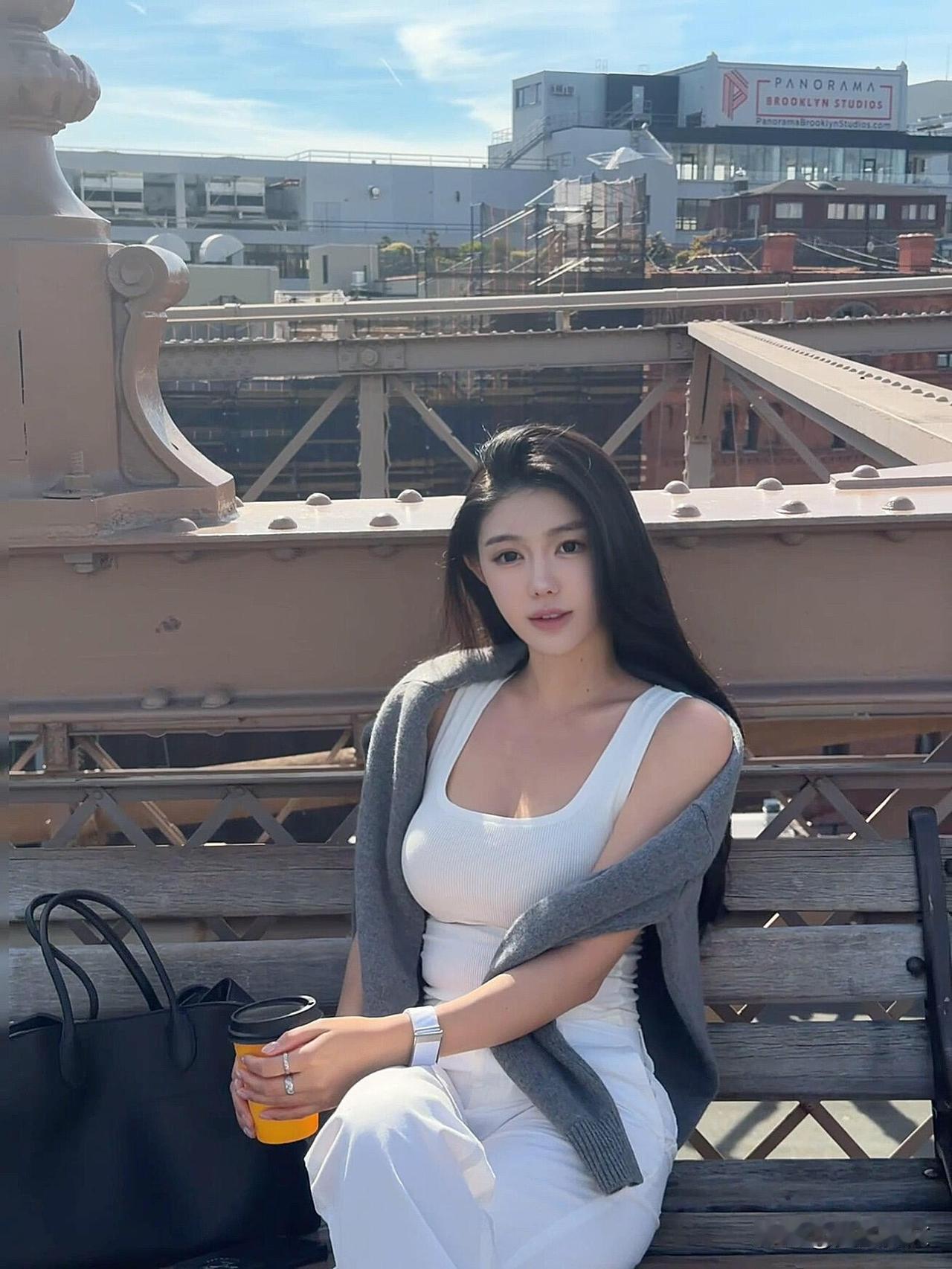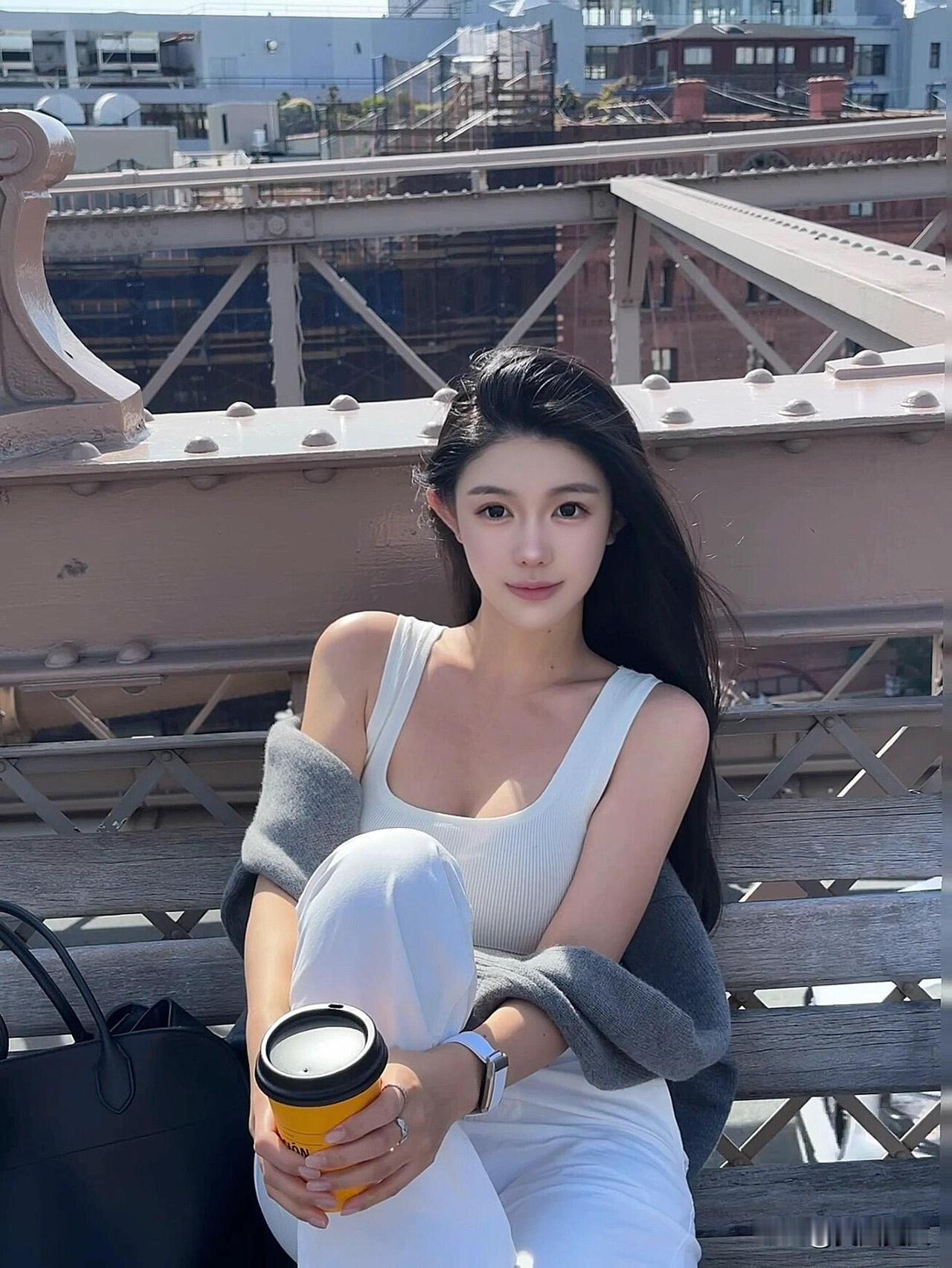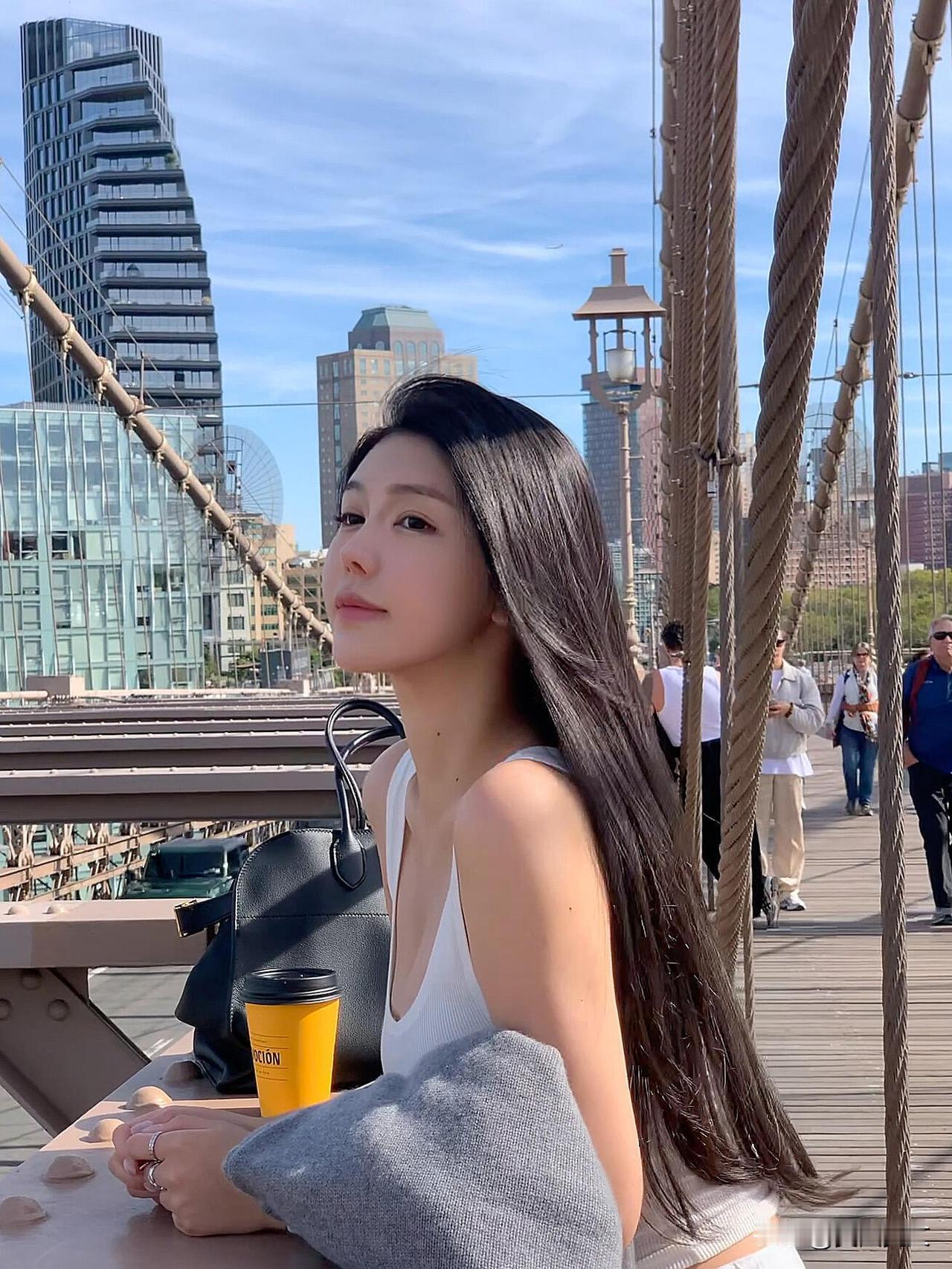 在布鲁克林大桥上,享受阳光与咖啡的悠闲时光。