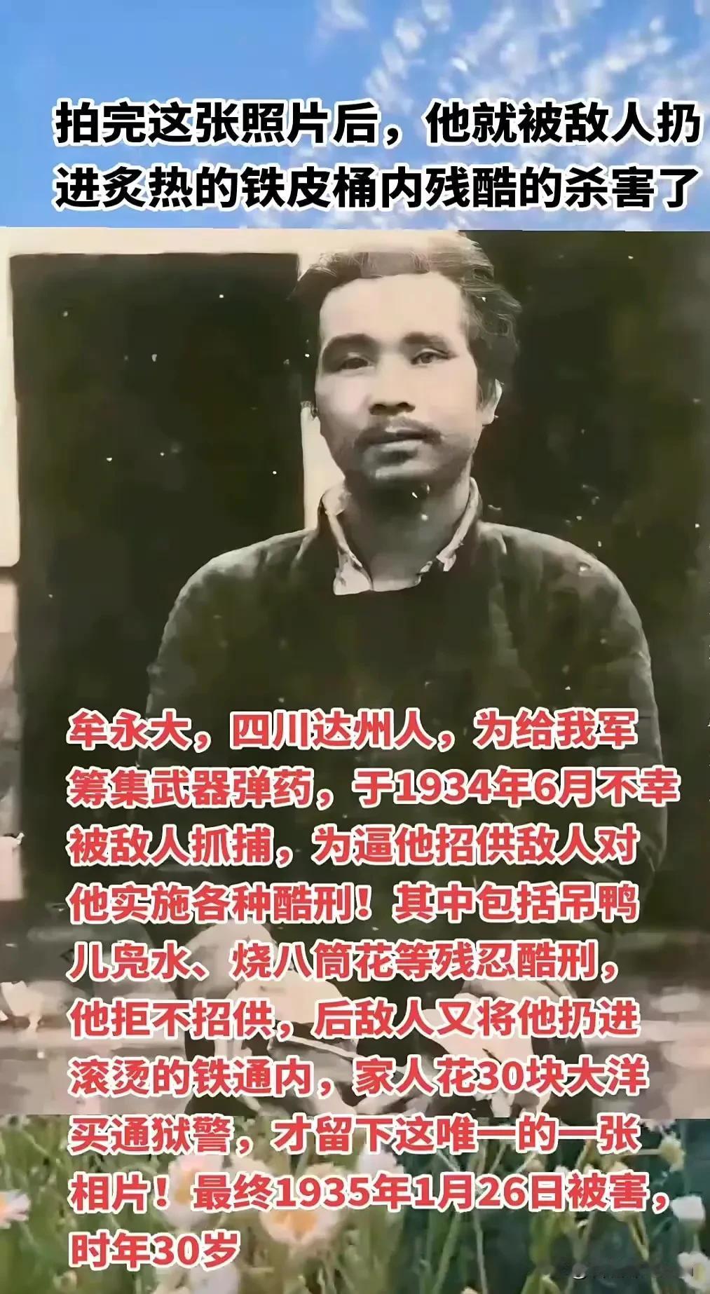 1940年代,30岁,他被塞进烧红的铁皮桶,皮肤烫得滋滋作响,敌人的烙铁还在往肉里按——可哪怕惨叫震碎了审讯室,牟永大硬是咬紧牙关,半个字的秘密都没吐! 这段记载里的时间略有偏差,真实的牟永大牺牲于1935年1月,年仅30岁,四川达县蒲家场人。 他打小跟着母亲相依为命,见惯了地主对乡邻的欺压,骨子里早埋下了反抗的种子。17岁在高中读书时,就带头走上街头抵制日货,把自家攒钱买的日货当众烧掉,为此被校长视作“激进分子”,差点被开除。 1925年,牟永大在上海求学时接触到共产主义思想,当即加入中国共产党。两年后从南京政法学校毕业,他放弃了能谋得安稳生活的机会,一头扎进工人和农民中间。 白天在工厂和工人们一起扛活,晚上就开办夜校,既教识字也讲革命道理,告诉大家“被剥削不是命,团结起来才能当家做主”。 1928年他回到四川,组织农民协会发动抗捐抗税,很快成了军阀刘存厚的“眼中钉”。被通缉后转移到成都,借着同学的关系隐藏在军队里,依旧没停下手头的工作。 1933年红军撤离达县,他奉组织命令化名打入县政府,秘密组建“绿衣社”,把敌军布防、物资储备等情报一次次送到根据地,还悄悄转运弹药支援前线。 他的暴露源于叛徒出卖。 1934年6月的一个傍晚,正在传递情报的牟永大被敌军包围,反抗中手臂中弹,最终被捕。敌人知道他的身份不一般,一开始还想诱降,许诺只要供出同伙和联络点,就能立刻恢复自由,还能给官做。牟永大盯着敌人,嘴角扯出冷笑,一句话都没应。 诱降不成,酷刑接踵而至。老虎凳上的砖块垫到第三块,他的腿骨发出脆响,仍咬着牙骂敌人无耻;“吊鸭儿凫水”把他头朝下浸入冰水里,呛得肺里全是水,醒来第一句还是“你们这群豺狼活不长”。 敌人换了更狠的法子,将易燃绳扭成蚊香状缠在他背上点燃,火焰啃噬皮肤的焦糊味弥漫整间牢房,他疼得浑身抽搐,骂声却没停过。 烧红的铁皮桶是最后的折磨。敌人把他绑在桶壁上,高温瞬间烫得皮肤起泡、脱落,滋滋声里混着他的惨叫,连年轻的狱卒都不忍直视,转过头红了眼眶。 “说不说?不说就把你活活烤死!”敌人的嘶吼砸在他耳边,牟永大已经没力气骂了,只是用尽力气摇头,嘴唇咬得鲜血直流。 这样的折磨持续了大半年,组织多次设法营救都没能成功。敌人见实在撬不开他的嘴,终于下定决心处决他。 家人得到消息后,四处借钱凑了30块银元,买通狱卒想再见他一面,最终只换来拍一张遗照的机会。照片里的牟永大穿着破烂长衫,手脚都戴着镣铐,浑身是伤却腰杆笔直,眼神里没有丝毫怯懦,只有对信仰的坚定。 1935年1月26日,达城南门河坝挤满了人。敌人让他跪下,牟永大硬生生站着不肯弯腿,高声喊出“共产党万岁”。 这句口号彻底激怒了敌人,他们把他拖向刑场,最终用最残忍的方式结束了他的生命。他牺牲时,川陕省苏维埃副主席的身份还没被公开,直到多年后整理史料,人们才知道这位硬汉为革命做了多少事。 牟永大的遗照留存至今,照片里的伤痕遮不住傲骨。有人说他傻,用生命换一个看不见的未来,可正是这份“傻”,支撑着无数像他一样的人前赴后继。 敌人能摧毁他的身体,却永远磨不掉他心中的信仰;酷刑能带来剧痛,却永远撬不开守护秘密的嘴。他的牺牲不是结束,而是照亮后来者道路的一束光。 信仰从不是空洞的口号,是牟永大在铁皮桶里咬紧的牙关,是他面对烙铁不松的口风,是他临刑前不肯弯曲的膝盖。那些为了信念甘愿赴死的人,从来都不是天生的英雄,只是把家国大义看得比生命更重。 各位读者你们怎么看?欢迎在评论区讨论。