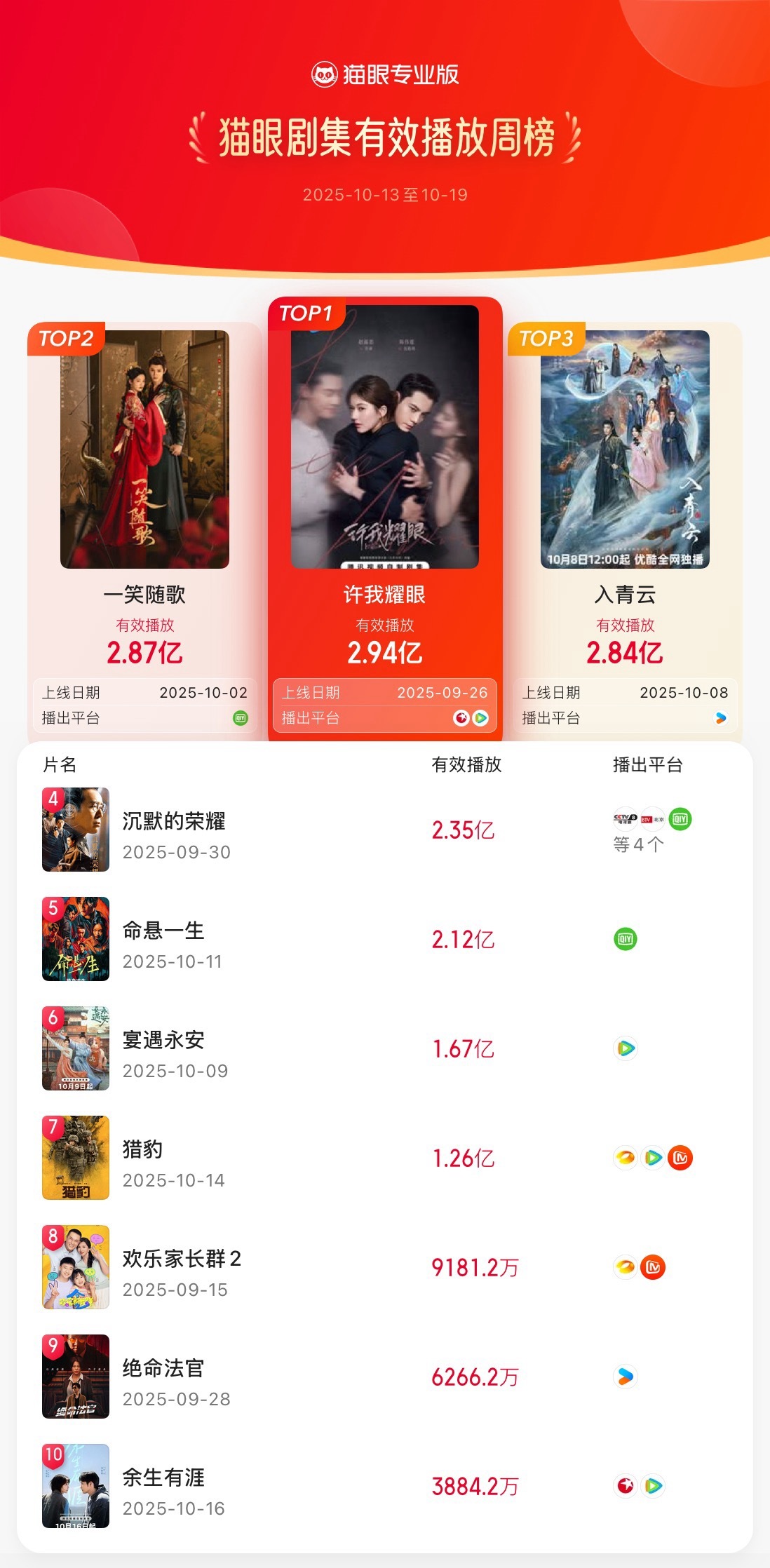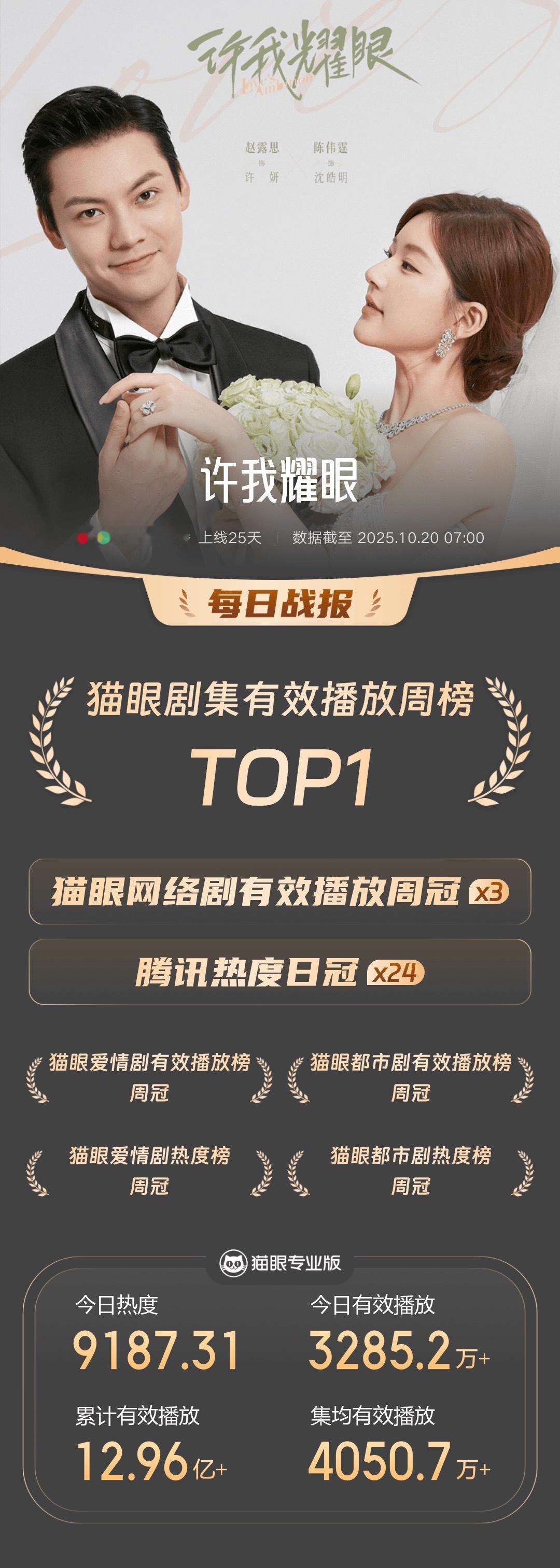 许我耀眼[超话]许我耀眼有效播放持续霸榜 据猫眼专业版数据,赵露思 领衔主演网络剧《许我耀眼》收官热度不减,连续3周登顶猫眼有效播放周榜,截至当前全网有效播放量已超13亿!许我耀眼有效播放量破13亿