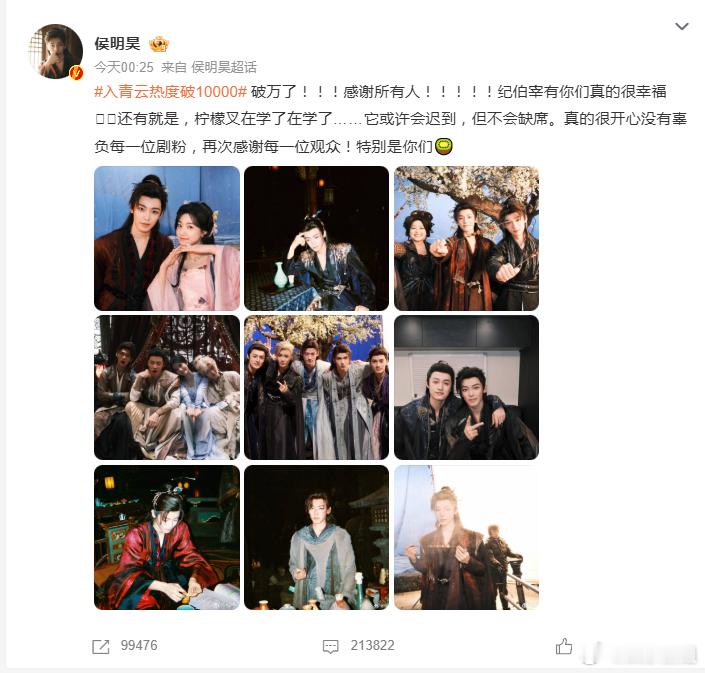 侯明昊在学柠檬叉《入青云》破万,侯明昊发文感谢所有人,很开心没有辜负每一位剧粉,纪伯宰有你们很幸福,《柠檬叉》在学了,虽会迟到但不会缺席,那就坐等啦!恭喜又一部破万剧,优酷三部一番剧全破万扛剧生的含金量🈶入青云 ​​​