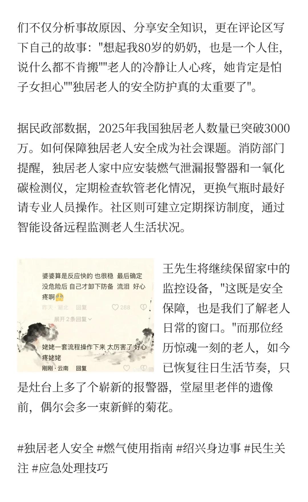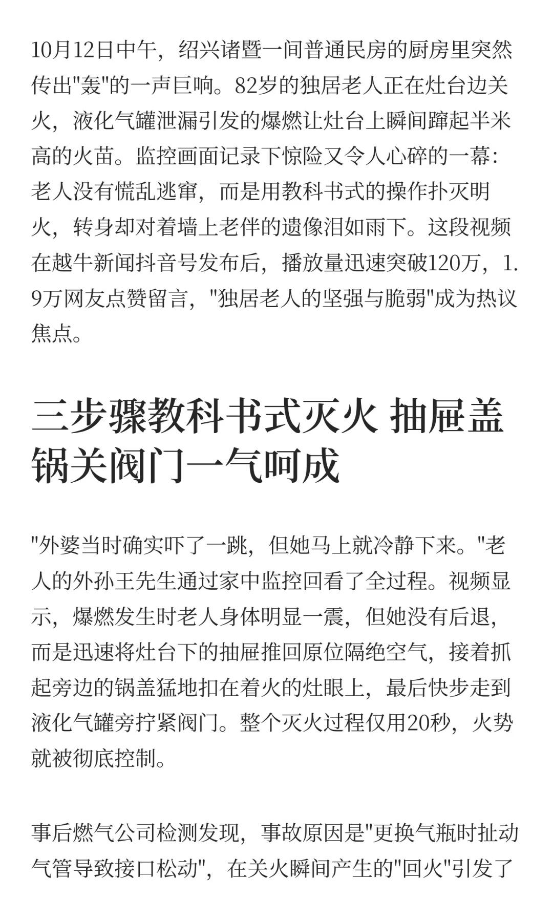 八旬独居老人煤气爆燃后冷静灭火 转身对老 独居老人安全 燃气使用指南 绍兴身边事 民生关注