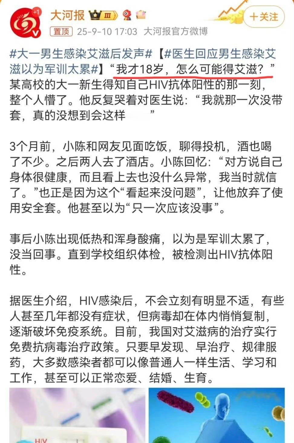 18岁男生见网友后感染艾滋这孩子太可惜了[叹气]!家长要给孩子普及性知识,让孩子