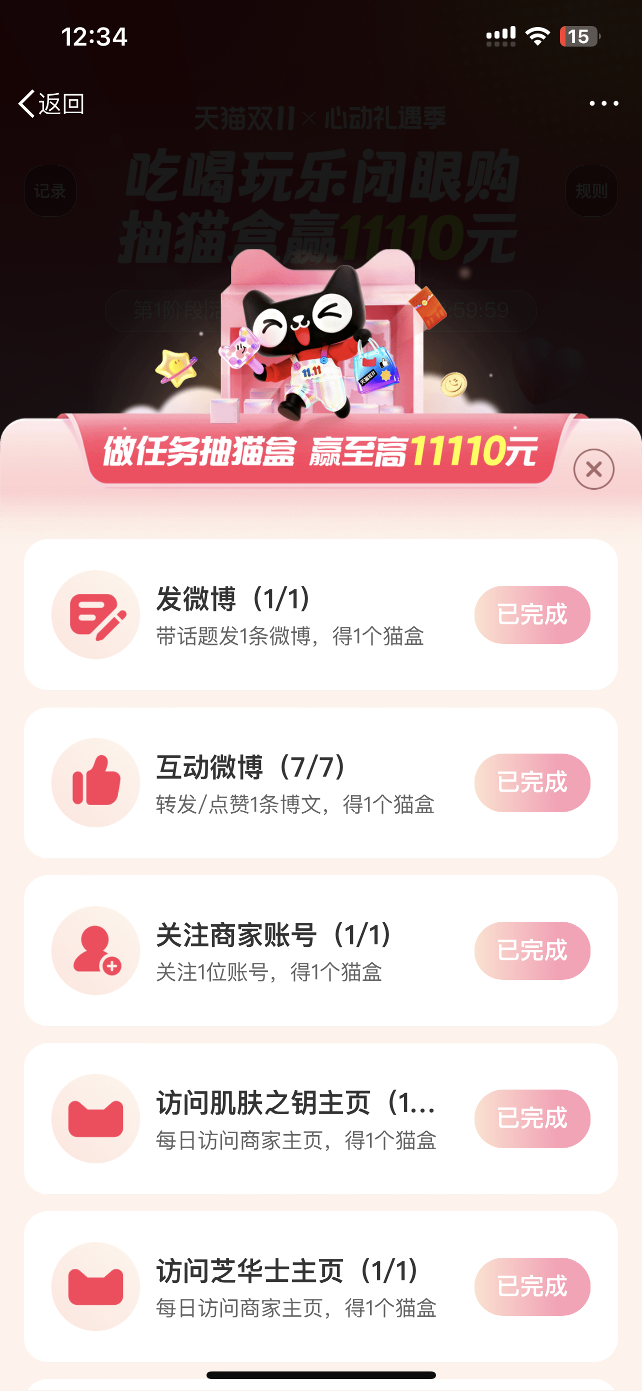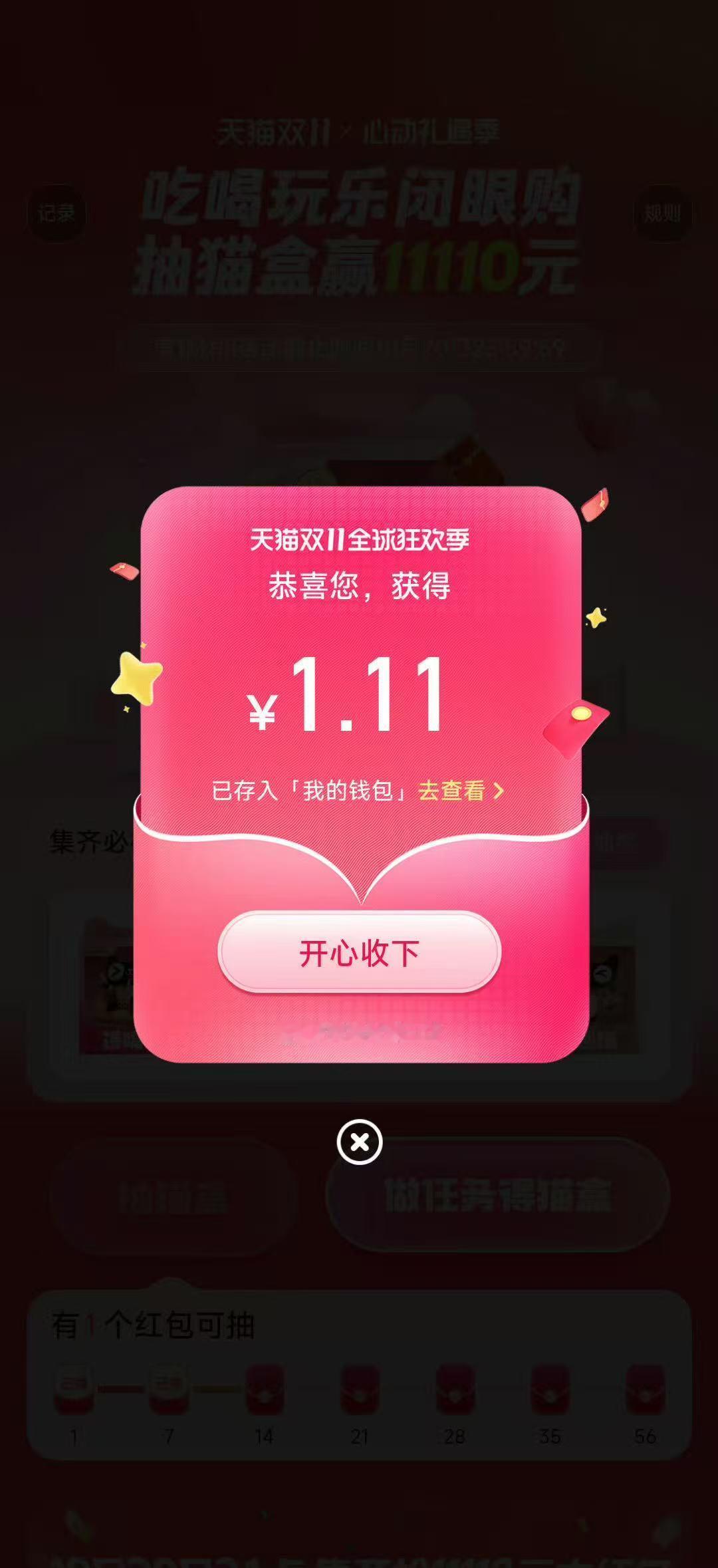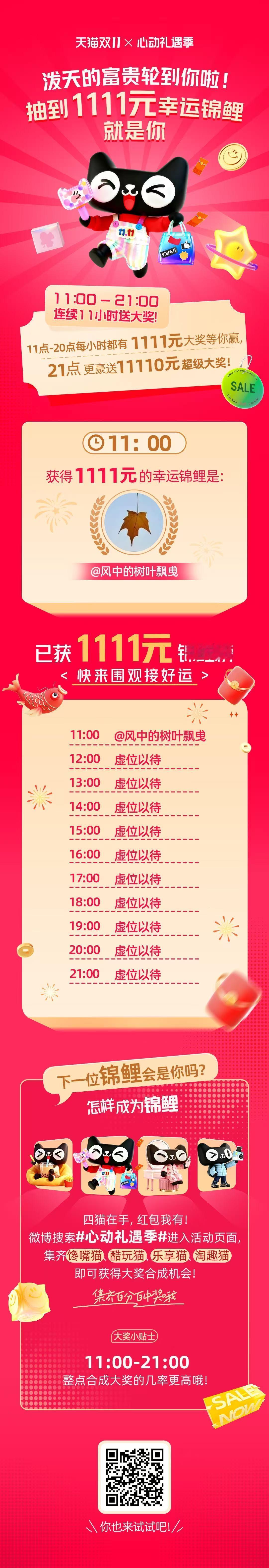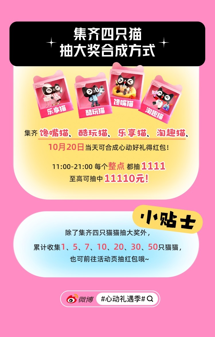 刚研究出的抢红包攻略赶紧甩出来:打开微博搜心动礼遇季 就能进集猫盒活动页,签到、刷几条微博、转发下活动博文就能拿抽卡机会,集到的猫盒能直接兑换整点抢红包资格。重点是11:00-21:00每个整点都有红包雨,最高11110元大奖就藏在里面,现在微博评论区全是晒红包的,这火爆程度没谁了!今天的微博是懂发红包的